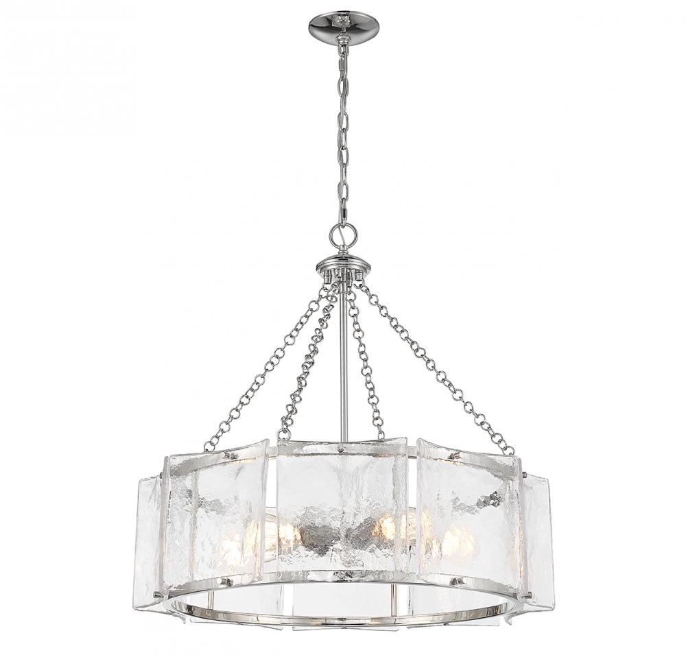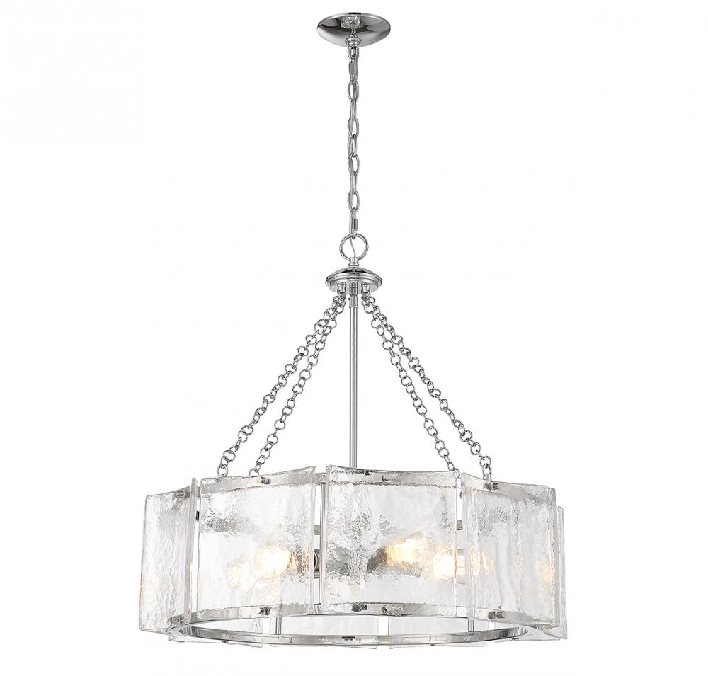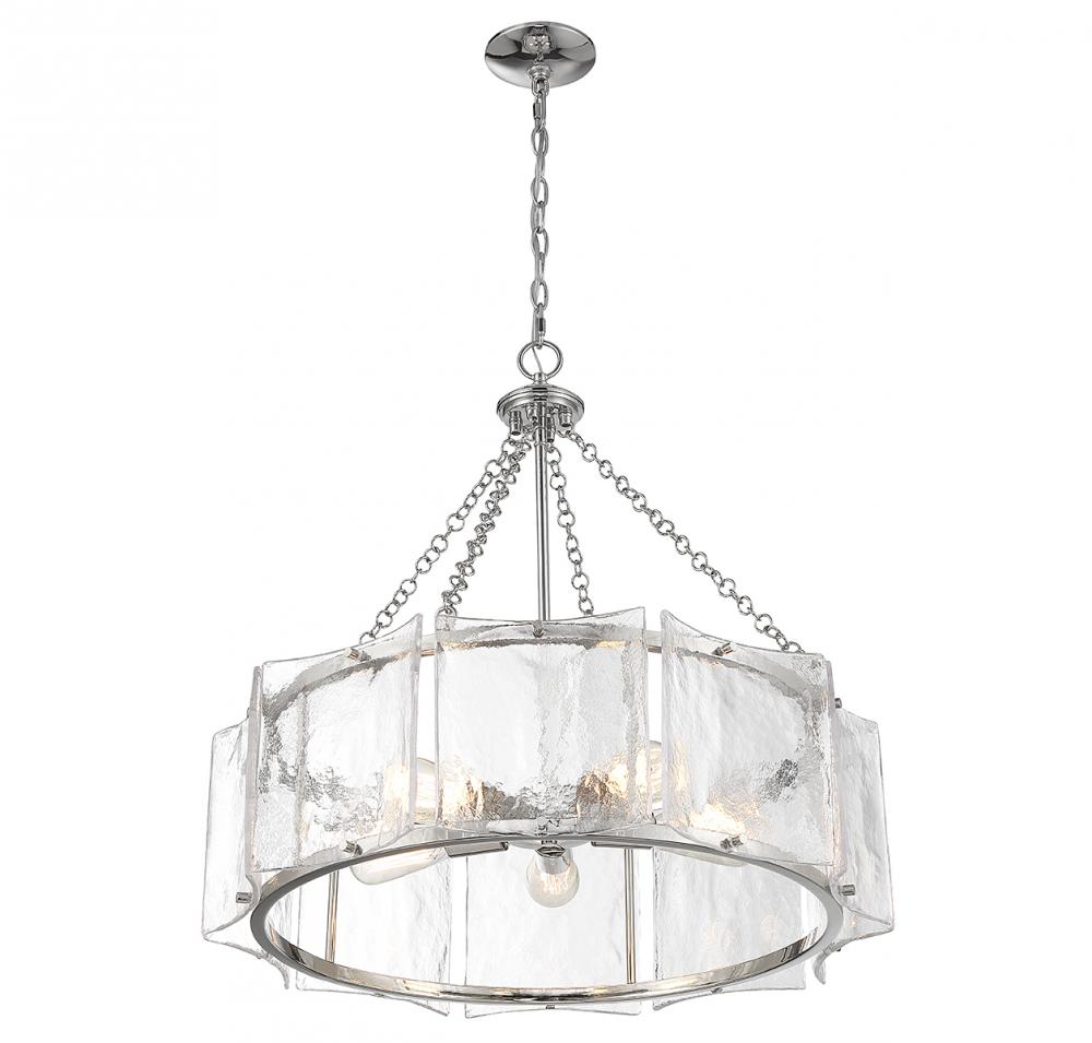 Bring a beautiful ocean-inspired lighting look to your home with the Savoy House Genry 5-light pendant. It is decorated with rippling panes of handmade glass and finished in polished nickel. Genry is 25.5" in height and 26" in width. It uses 5 standard size bulbs of up to 60 watts per bulb (bulbs not included).