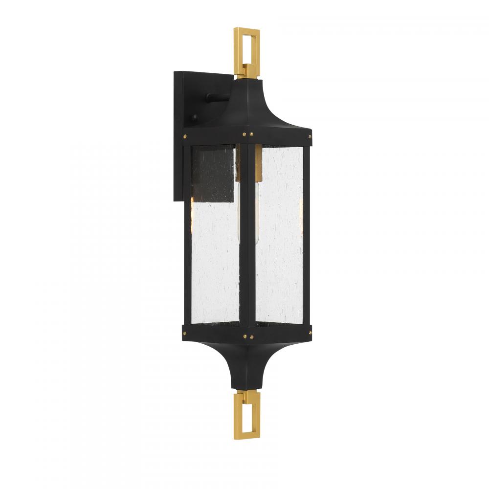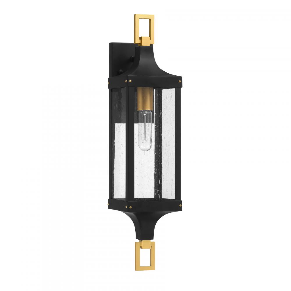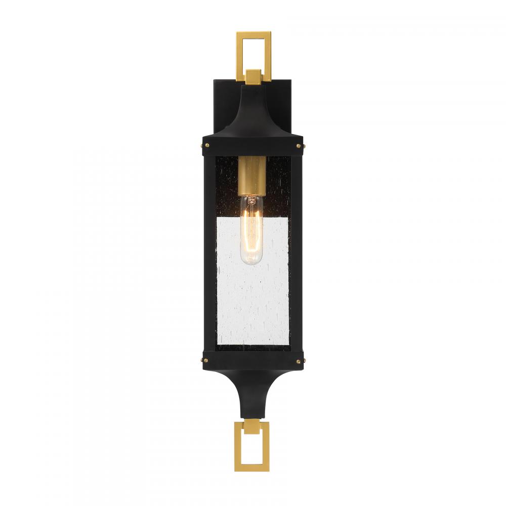 Featuring a handsomely constructed look that recalls designer jewelry, the Savoy House Glendale 1-light outdoor wall lantern effortlessly emboldens any outdoor space. Buckle and screw detailing is finished in Weathered Brushed Brass to contrast beautifully with the Matte Black finish. Clear seeded glass adds texture and drama. Glendale is 24.5" in height, 5.75" in width and extends 7" from the wall. Uses one standard size bulb of up to 60 watts. The bulb is not included. Wet area rated.
