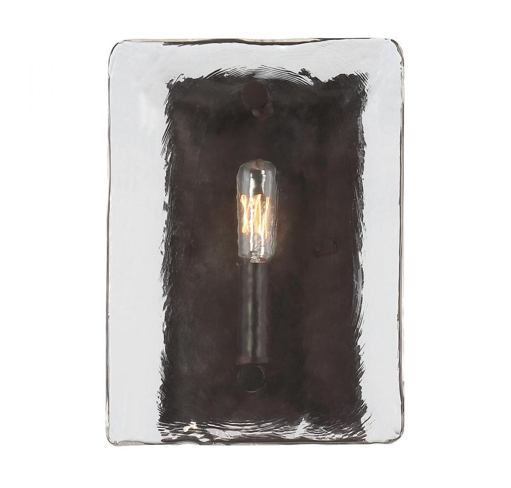 In the Savoy House Glenwood 1-light sconce, strong geometric lines combine with gorgeous glass for a look you'll love every day. Designed by Brian Thomas, the straightforward framework of the Glenwood has a classic English bronze finish that blends well with other hardware in your home. A pane of Piastra glass is held in front of the backplate, creating an artisan aesthetic. The 60W candelabra size bulb provides beautiful light and the 8" wide by 11" high size is ideal to place one or more of these sconces along the walls of your dining room, kitchen, foyer, living room, hallway, family room, bedroom, great room, office, media room or stairway.