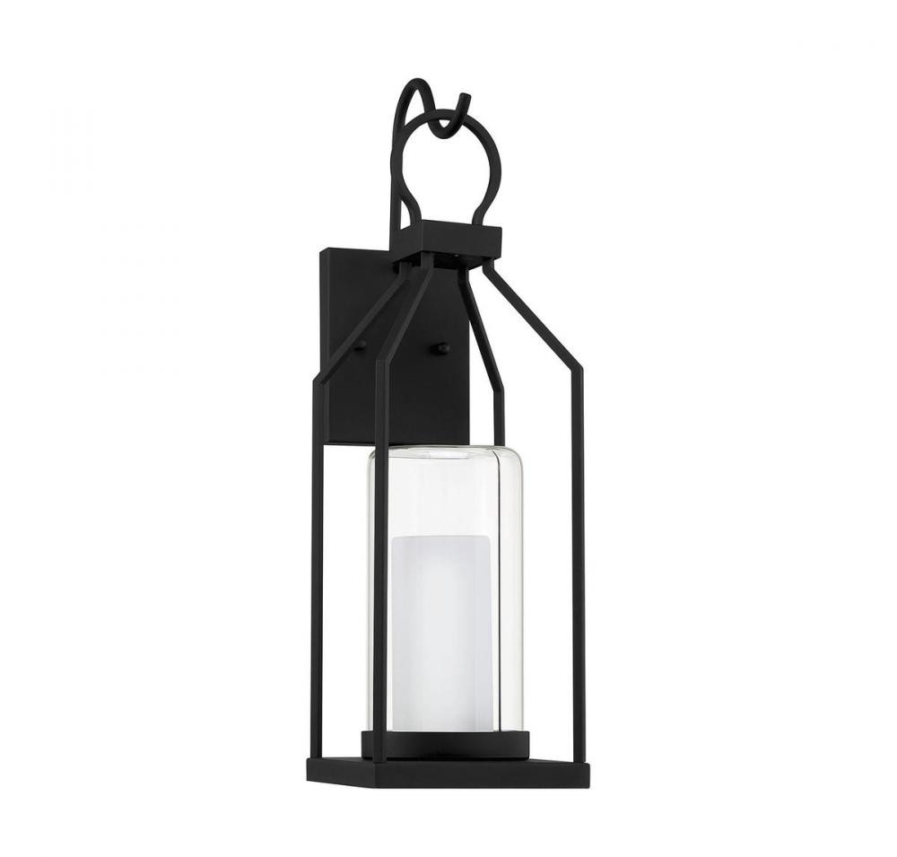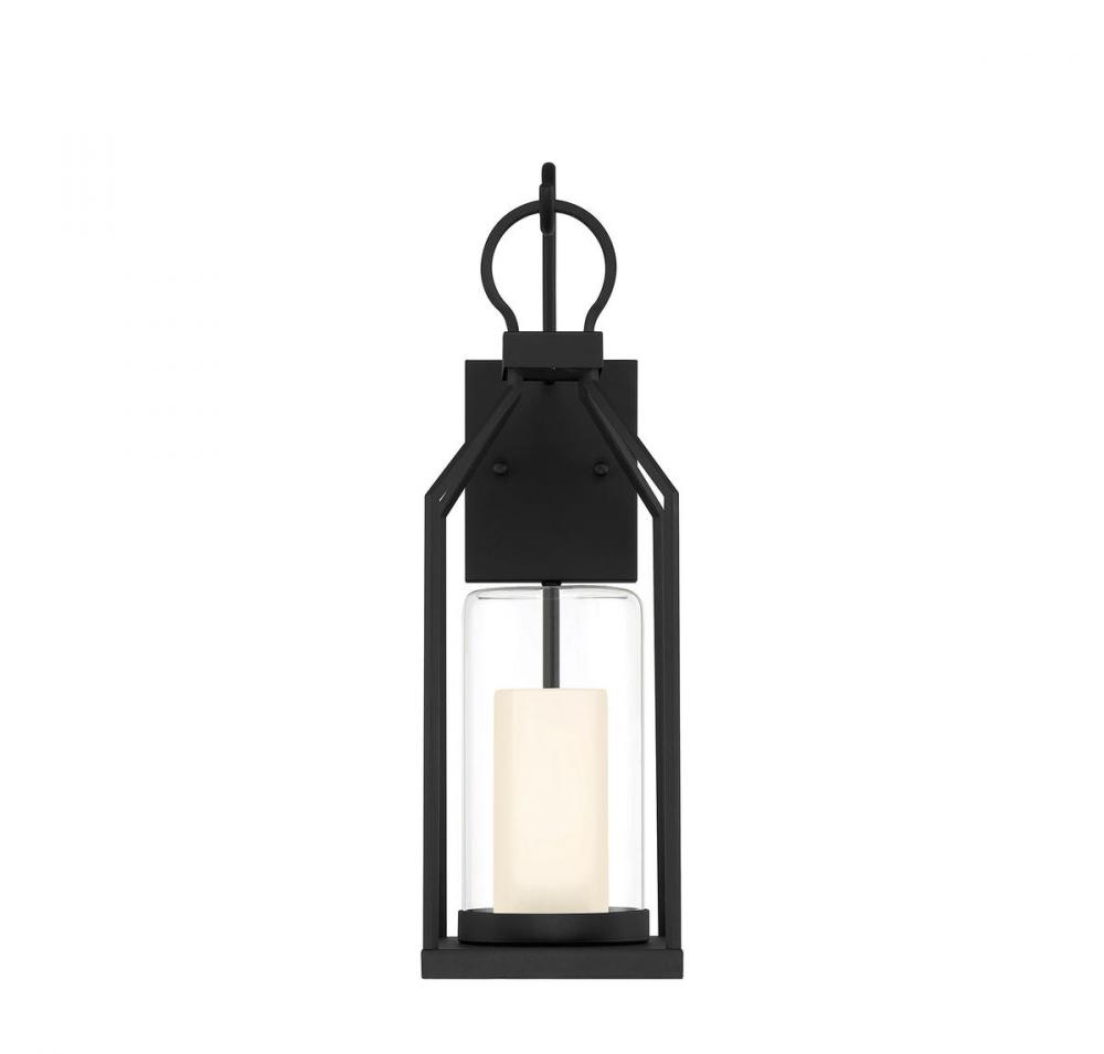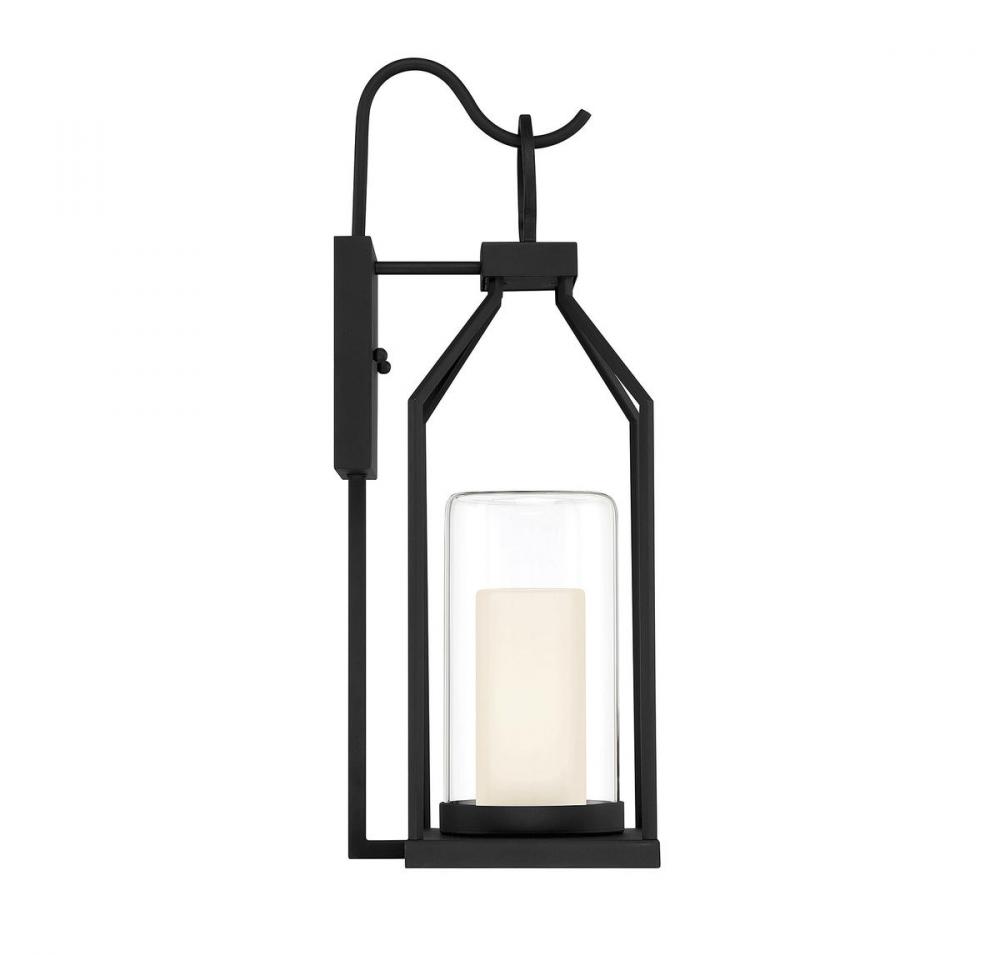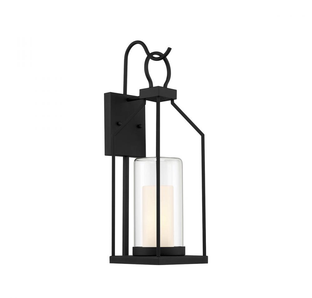 Light the way home with the lantern-inspired style of the Savoy House Hamilton 1-light outdoor wall light. A white opal glass shade, held within a protective clear glass shade, recalls the look of candlelight. The matte black finish makes Hamilton a great choice for lighting a wide variety of homes. Hamilton is 21" in height, 6.5" in width and extends 8" from the wall. It uses one candelabra size bulb of up to 60 watts per bulb. Wet area rated.