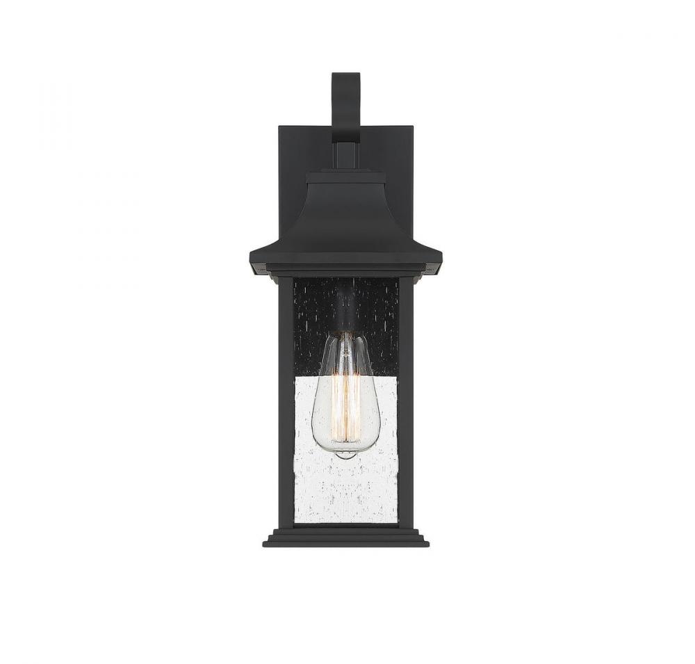 Create a stylish first impression outside your home with this Savoy House Hancock 1-light outdoor wall lantern. Crafted in a timeless classic style, it features a boldly sloped roof, shepherd's hook detailing and panes of clear seeded glass that ensures a beautiful, dramatic glow. A generously sized backplate helps to cover any holes left from replacing previous fixtures and the versatile black finish means that Hancock goes well with anything. Use this lantern beside your front and side doors or above your garage door. This fixture is 6.75" wide and 17.25" tall. It extends 7.5" from the wall. Uses one standard size light bulb of up to 60 watts (not included).