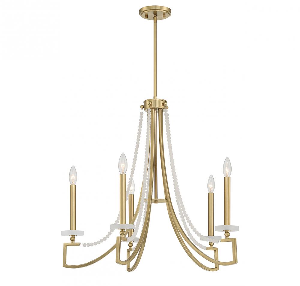 Featuring elegant strands of frosted beads and matching frosted bobeches, the Savoy House Helen 5-light chandelier adds a touch of classy style to the home. Warm brass finish. Helen is 26.25" in height and 27" in width. Comes with four 12" downrods and one 6" downrod. Uses 5 candelabra bulbs with a max of 60 watts per bulb (bulbs not included).
