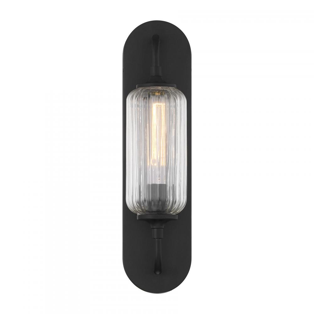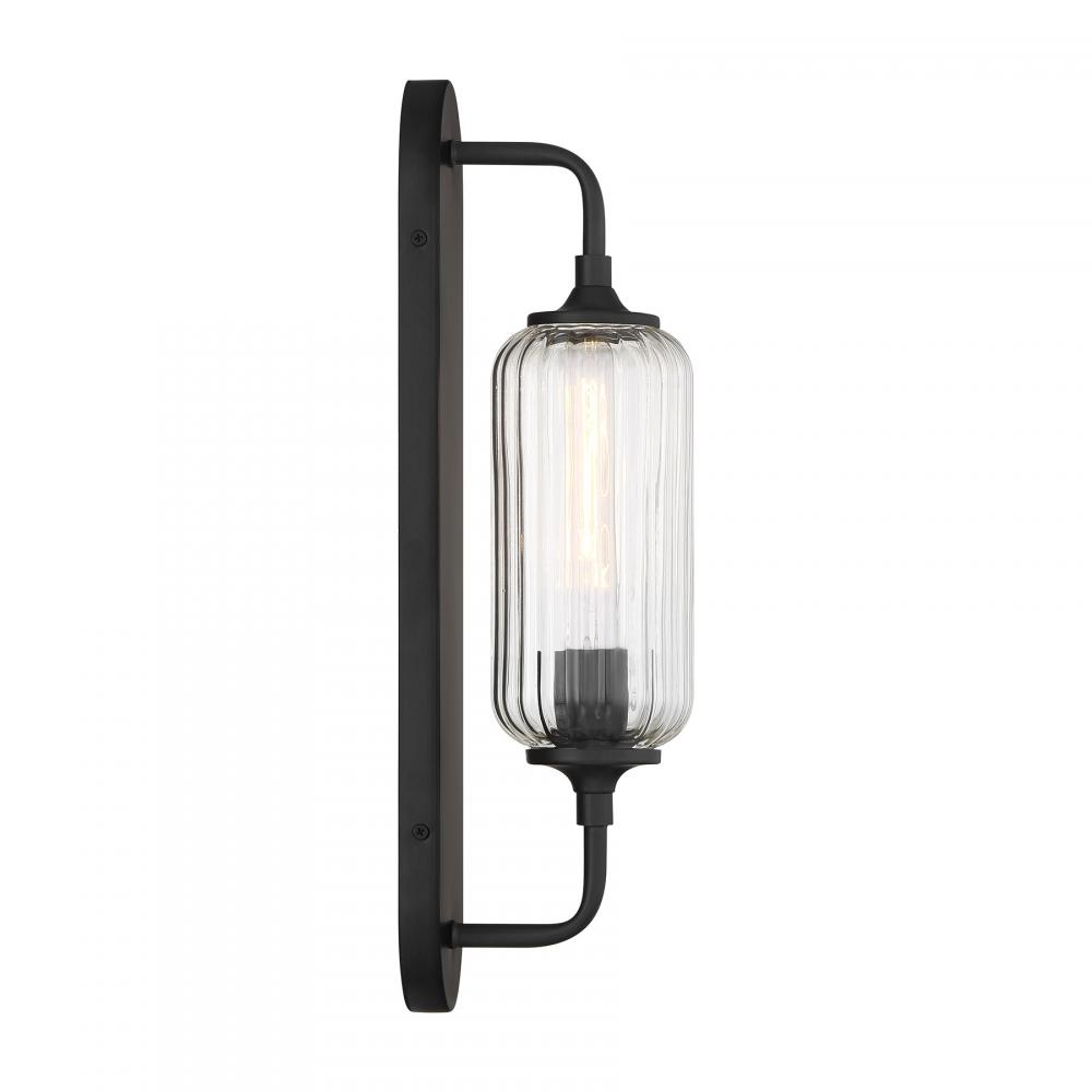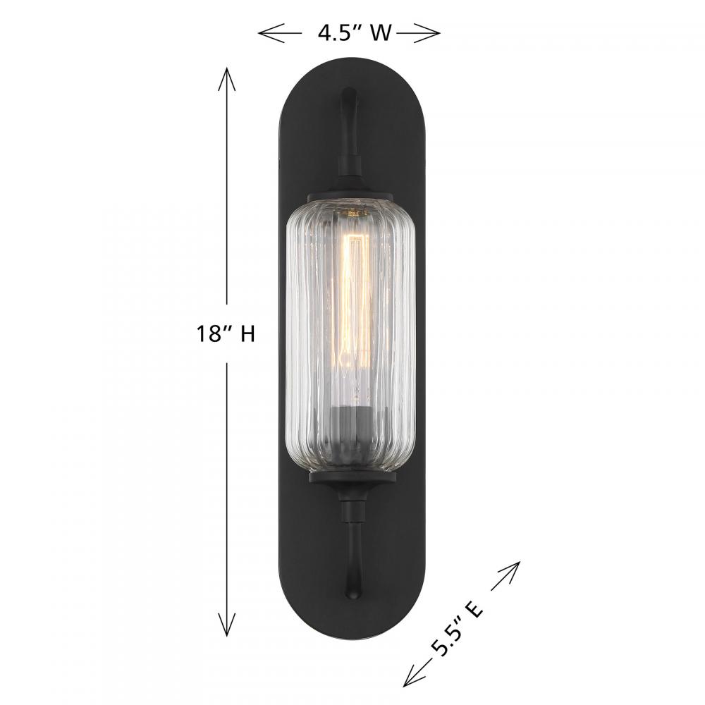 The Savoy House Holton 1-light sconce showcases an inventive and geometric style with a tall, rounded shade of clear ribbed glass and a slim, rounded structure finished in Black. It will bring a big dose of style to any space! Holton is 18" in height, 4.5" in width and extends 5.5" from the wall. It uses one standard size bulb of up to 60 watts. Bulb not included. This sconce is damp area rated.