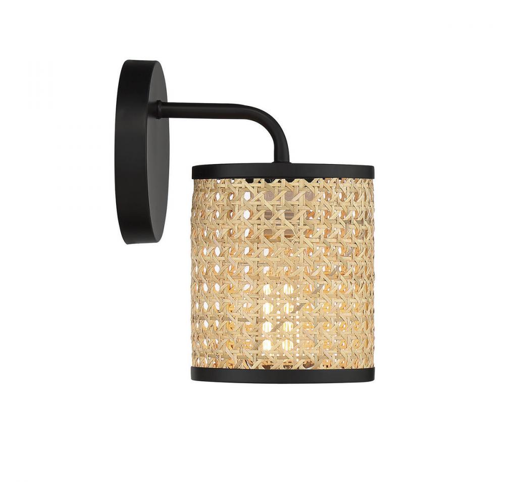 With the Savoy House Jaylar 1-light sconce, you can give any room a touch of relaxed organic style. A shade of woven cane brings texture and brightness while the matte black finish adds another dimension of flair. Jaylar is 9" in height, 5" in width and extends 7" from the wall. It uses a standard size bulb of up to 60 watts. Damp area rated.