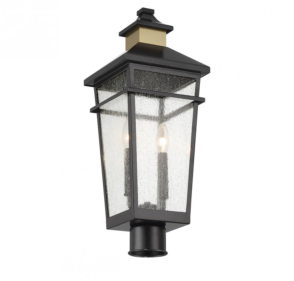 This Savoy House Kingsley 2-light outdoor post light has a coastal-inspired lantern style with highly fashionable touches. Panes of seedy glass are accentuated by a matte black finish with brass detailing at the hood. Kingsley is 22.5" in height and 8.5" in width. It uses 2 candelabra size bulbs of up to 60 watts per bulb (bulbs not included).