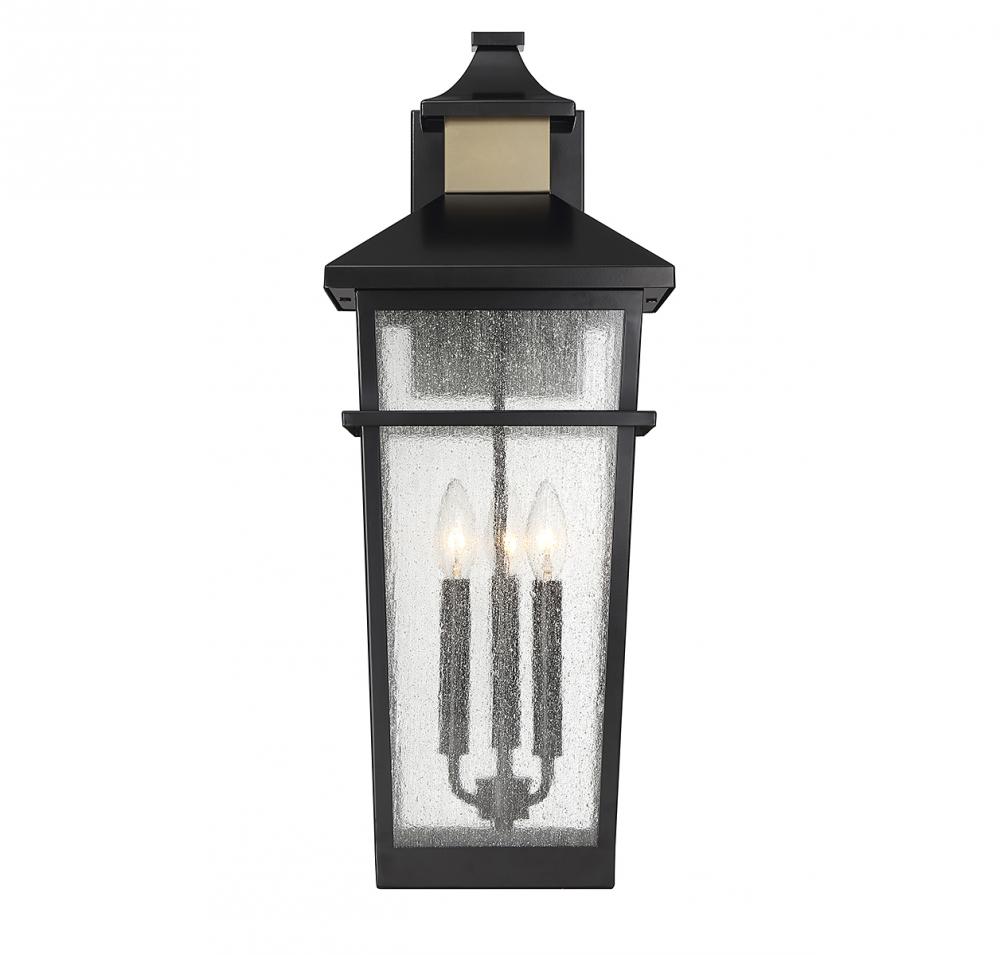 This Savoy House Kingsley 3-light outdoor wall light has a coastal-inspired lantern style with highly fashionable touches. Panes of seedy glass are accentuated by a matte black finish with brass detailing at the backplate and hood. Kingsley is 25.25" in height, 10" in width and extends 11.5" from the wall. It uses 3 candelabra size bulbs of up to 40 watts per bulb (bulbs not included).