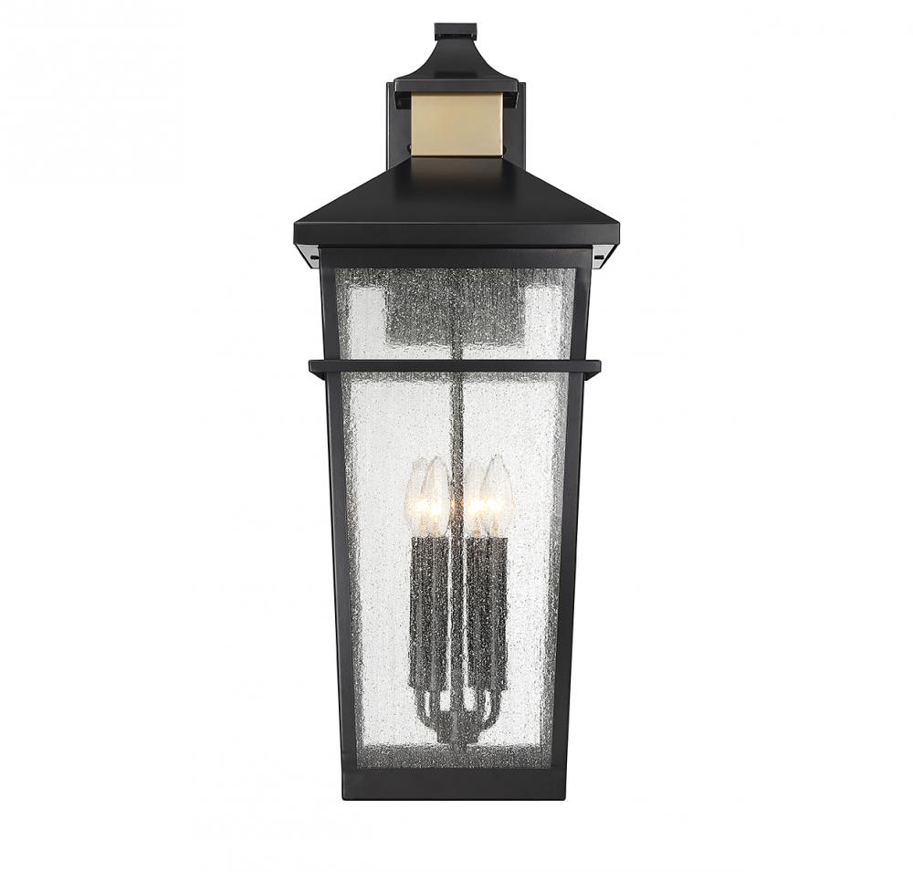 This Savoy House Kingsley 4-light outdoor wall light has a coastal-inspired lantern style with highly fashionable touches. Panes of seedy glass are accentuated by a matte black finish with brass detailing at the backplate and hood. Kingsley is 28" in height, 11.5" in width and extends 13" from the wall. It uses 4 candelabra size bulbs of up to 40 watts per bulb (bulbs not included).