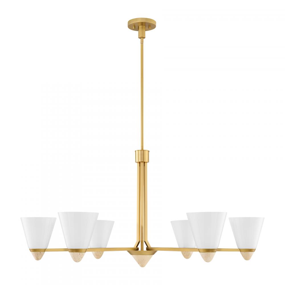 The Savoy House Kohlman 6-light chandelier is a perfect balance of the elegant and the organic. It flaunts conical shades of white opal glass paired with natural travertine accents and a Warm Brass finish. Another travertine accent serves as the finial of the chandelier. Kohlman is 40" in width and has an adjustable height ranging from 18" to 72". It uses six standard size bulbs of up to 60 watts per bulb. Bulbs not included. Comes with four 12" downrods and one 6" downrod.