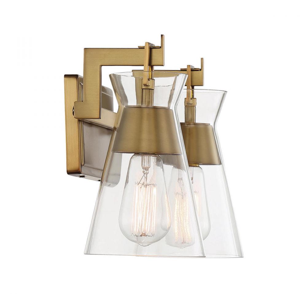 Conical shades of clear glass recall Italian midcentury modern lighting designs in the stylish Lakewood 2-light bath vanity light from Savoy House. The glass is suspended from angular reimaginings of shepherd's hooks and the fixture is finished in rich warm brass. Lakewood is 9.5" in height, 16" in width and extends 6.5" from the wall. It uses two standard size bulbs with a max of 60 watts per bulb. Damp area rated.