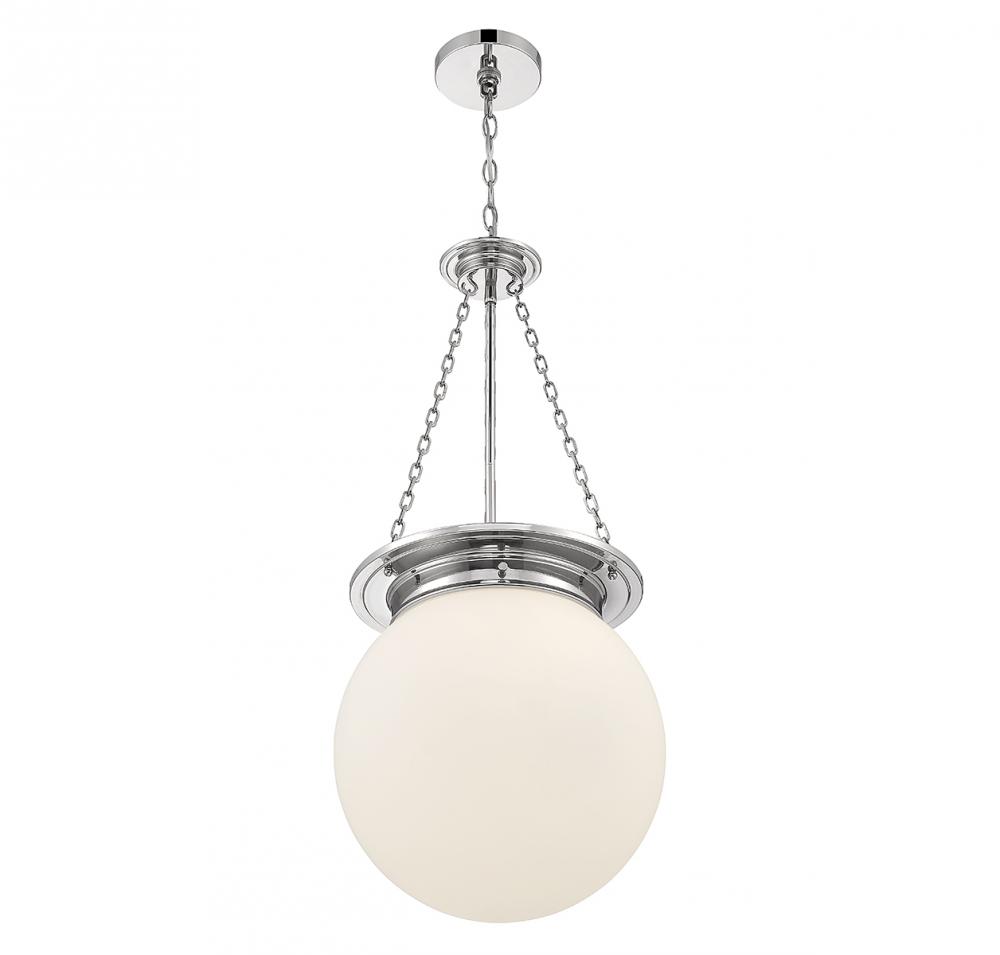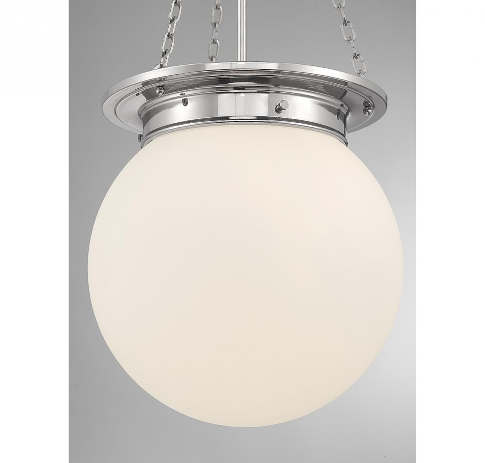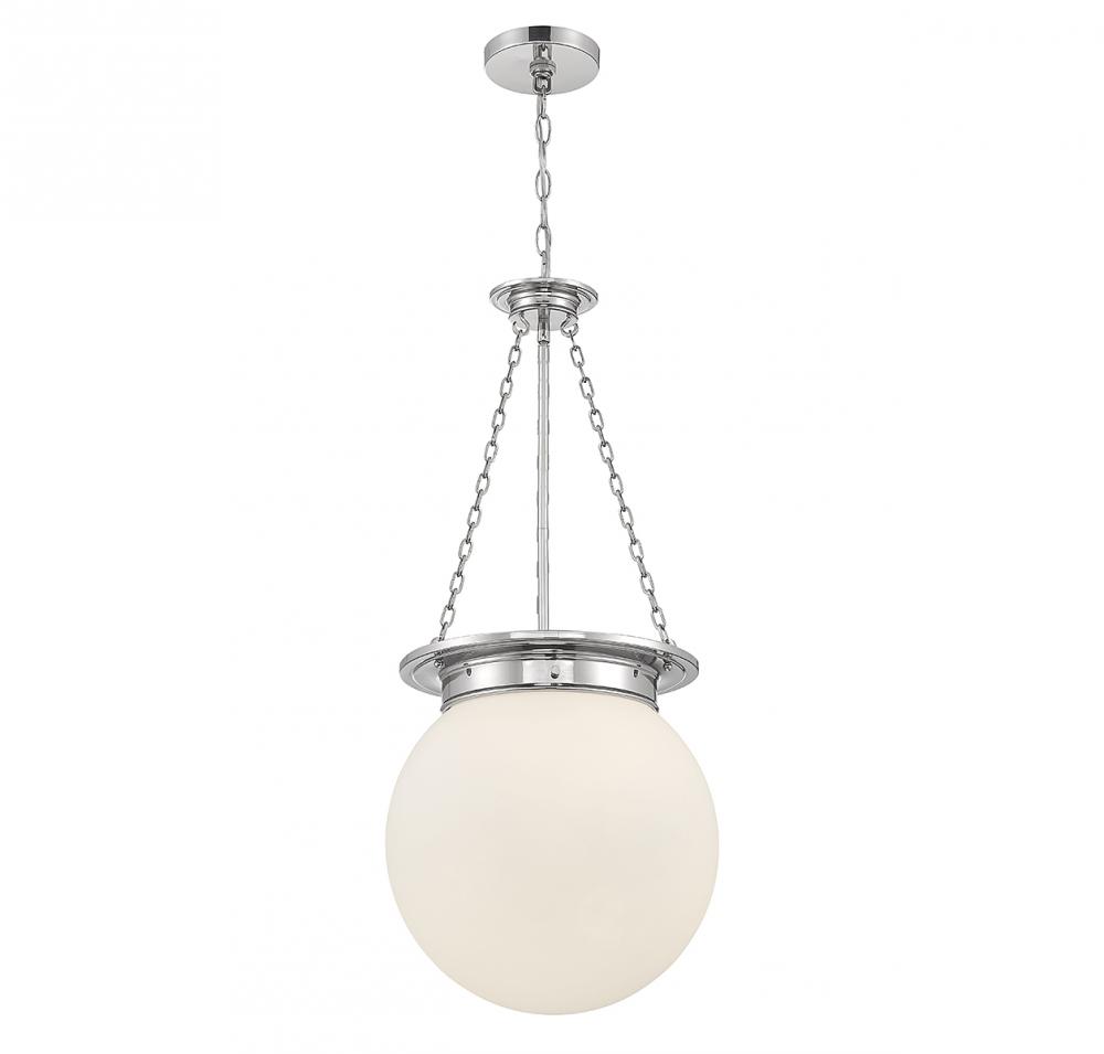 The Savoy House Manor 3-light pendant proves that a classic style can be stunning! An orb-shaped shade of white opal glass hangs down from an understated structure with timeless details. Finished in polished nickel. Manor is 31” in height and 13.5” in width. It uses 3 candelabra size bulbs of up to 60 watts per bulb (bulbs not included).