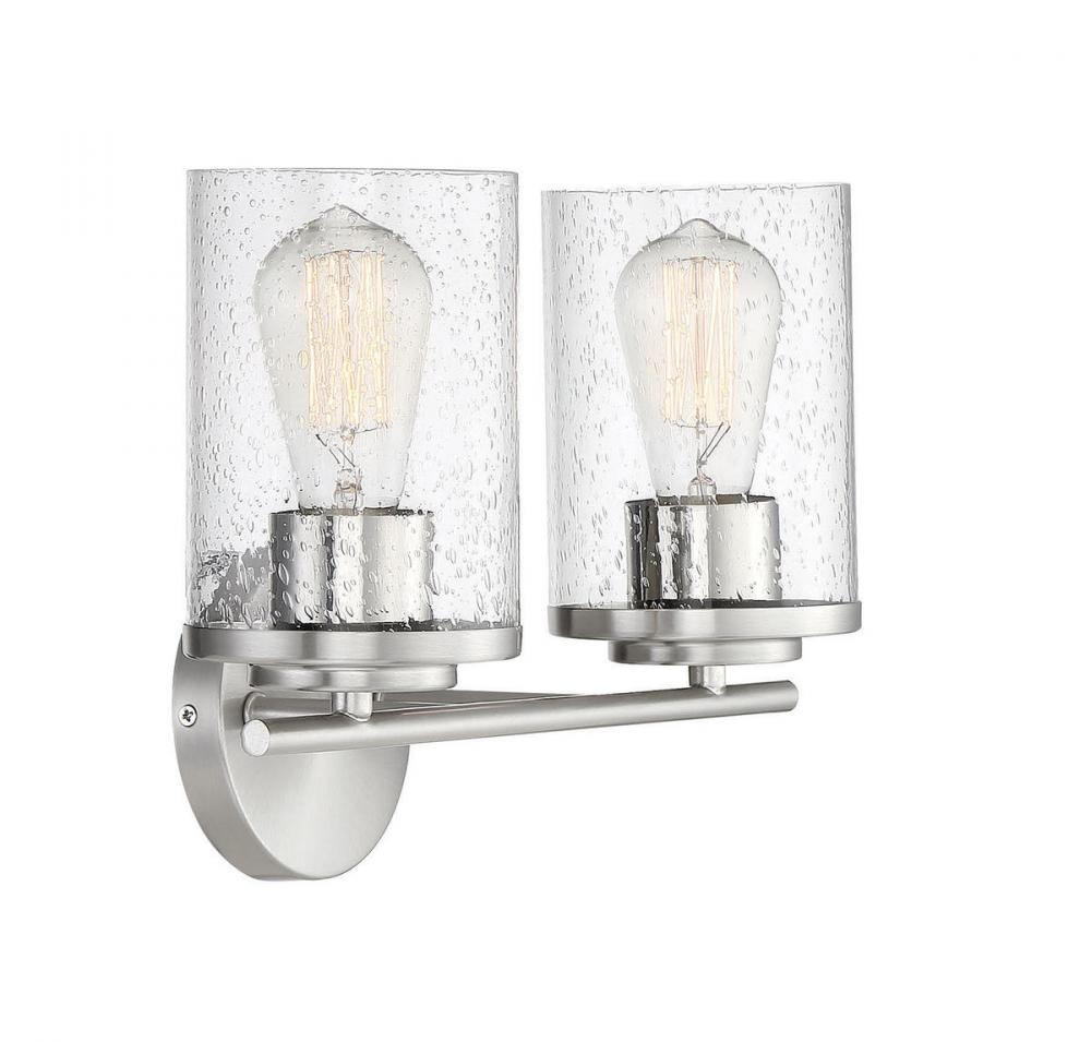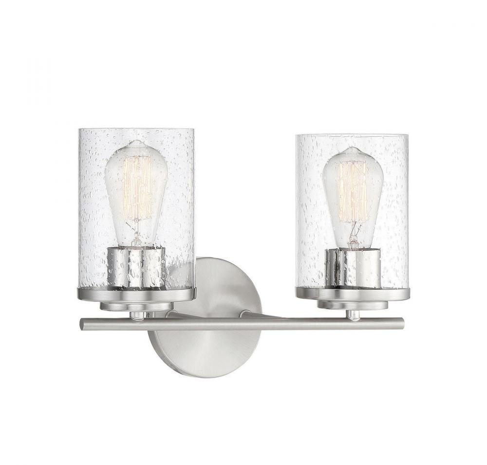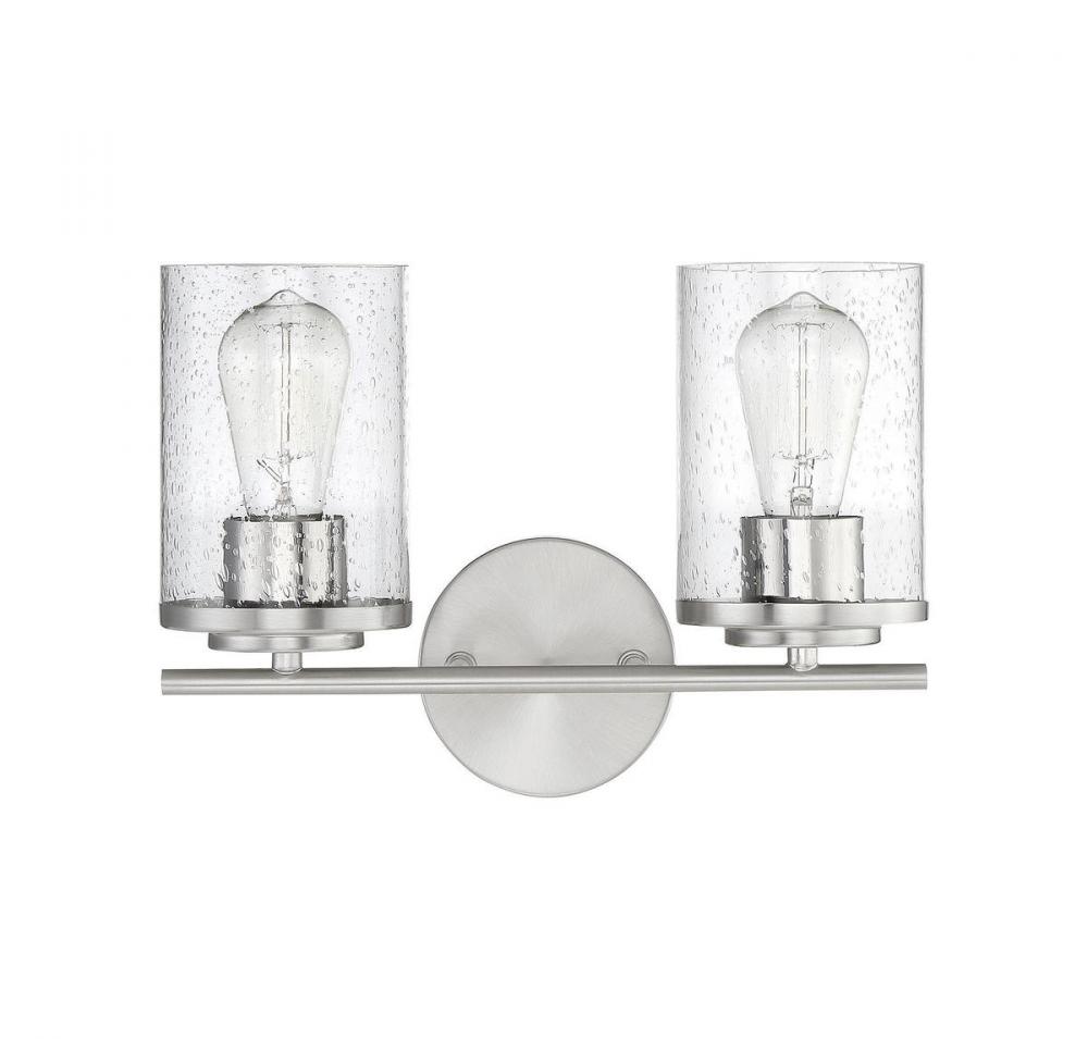 Illuminate your vanity mirror beautifully with this Savoy House Marshall 2-light bath bar. Its classic Americana look fits in perfectly with a wide variety of decor styles. The hurricane-style shades of clear seeded glass add a boost of drama and intrigue and the circular backplate brings in another dimension of thoughtful detailing. Finished in polished chrome. This fixture is 13.25" wide and 9.5" tall. It extends 6.5" from the wall. Uses 2 standard size bulbs of up to 60 watts each (not included).