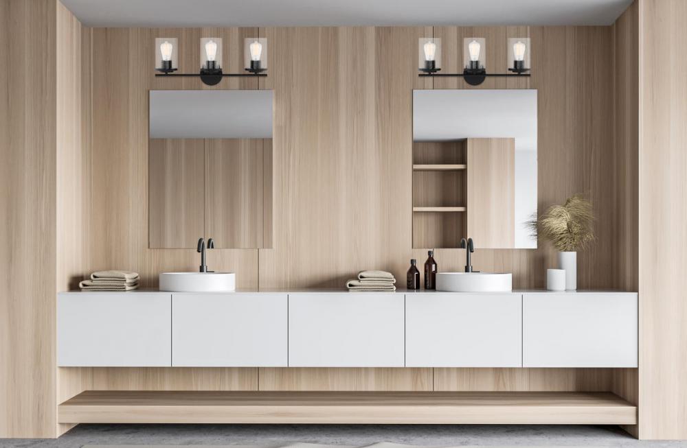 Illuminate your vanity mirror beautifully with this Savoy House Marshall 4-light bath bar. Its classic Americana look fits in perfectly with a wide variety of decor styles. The hurricane-style shades of clear seeded glass add a boost of drama and intrigue and the circular backplate brings in another dimension of thoughtful detailing. Finished in matte black. This fixture is 31" wide and 9.5" tall. It extends 6.5" from the wall. Uses 4 standard size bulbs of up to 60 watts each (not included).