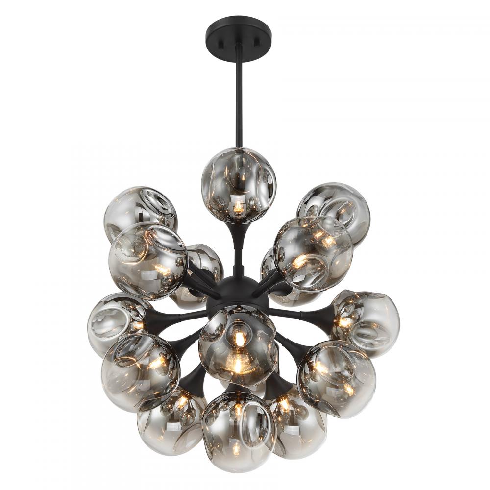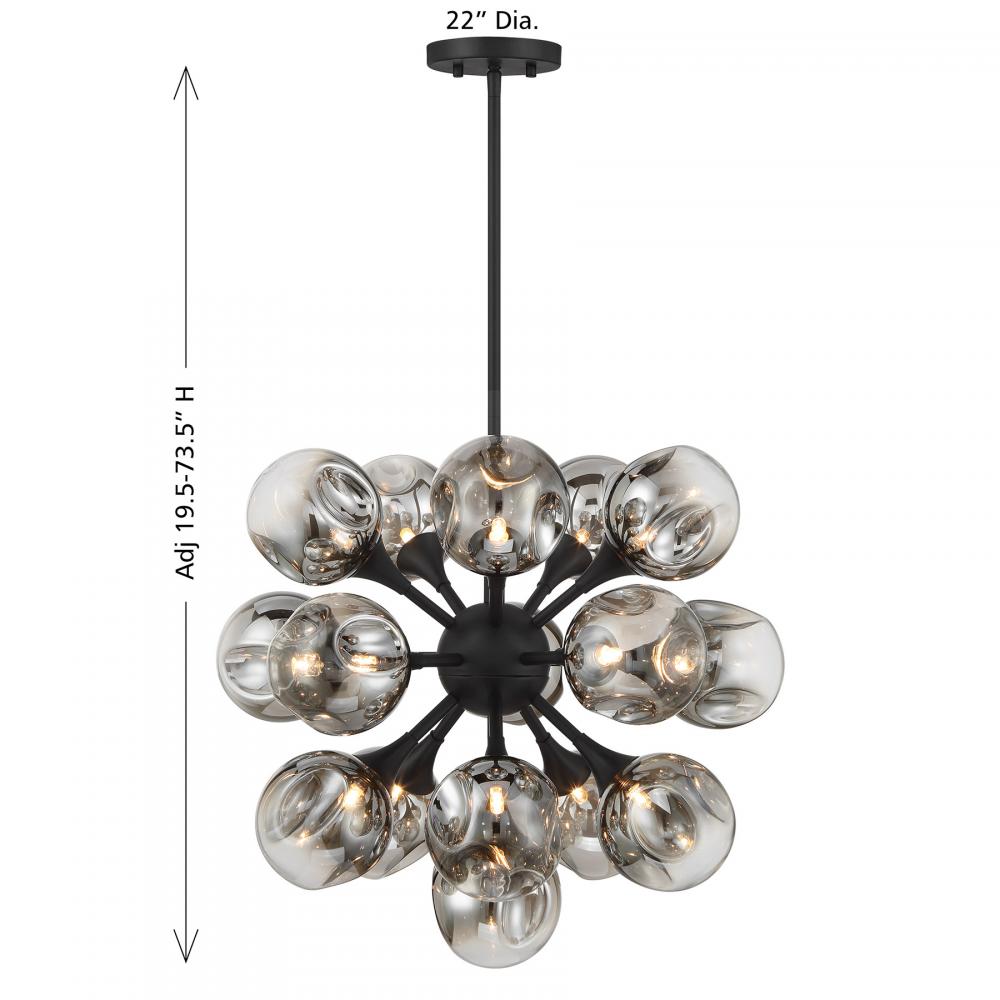 Heighten the drama of any room with the boldly beautiful Savoy House Matisse 16-light pendant. Its Sputnik style structure is studded with eye-catching dimpled shades of grey asymmetric plated glass and finished in Matte Black to create a spectacular look. Matisse is 22" in width and has an adjustable height ranging from 19.5" to 73.5". Uses sixteen G9 bulbs, which are not included. Comes with four 12" downrods and one 6" downrod.