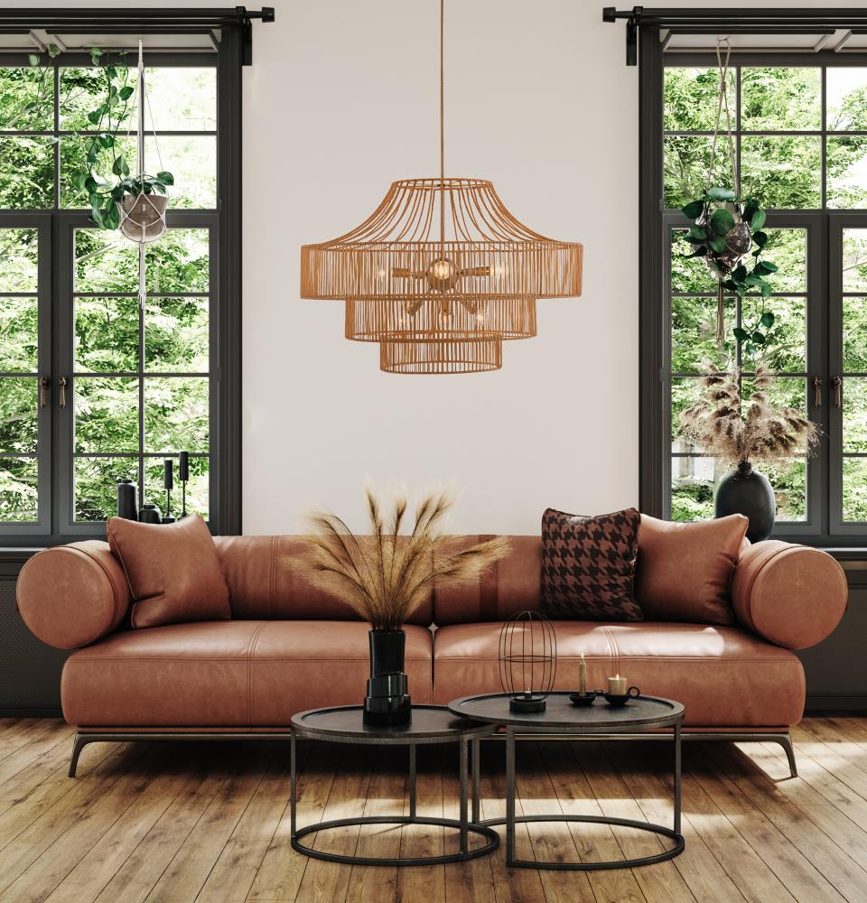Savoy House brings the natural beauty of rattan lighting to the great outdoors with the Medlock 8-light garden chandelier. A multi-tiered rattan resin shade creates touchable, eye-catching texture while the Burnished Brass finish adds boldness. Medlock is 22" in height and 32" in width. Uses eight candelabra size bulbs of up to 40 watts per bulb. Bulbs not included. Medlock is damp area rated and can also be used indoors.