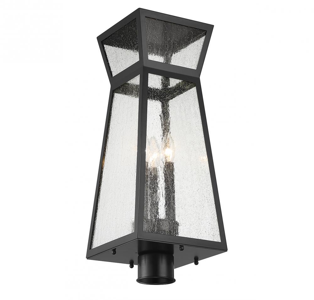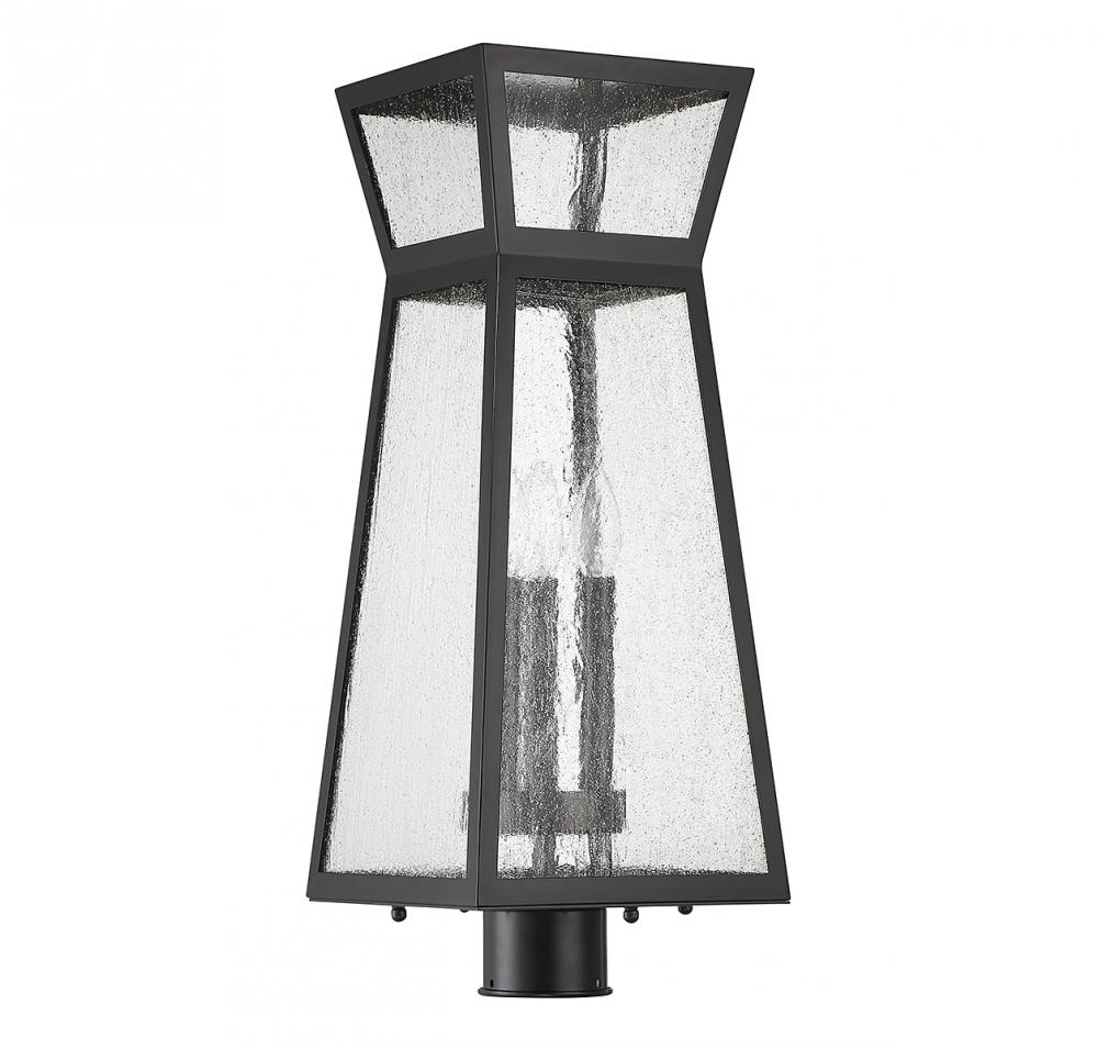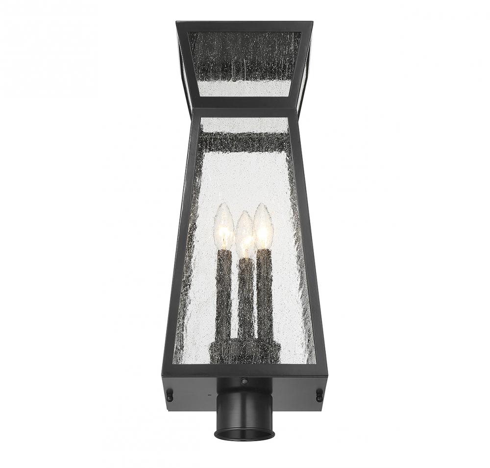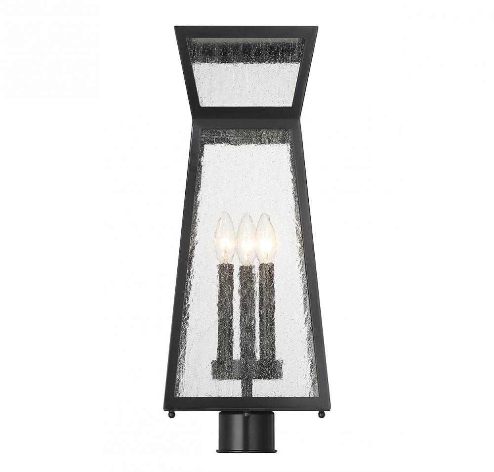 From Savoy House, the Millford 3-light outdoor post light showcases a more contemporary take on classic lantern-style illumination with a sharply angular shape and panes of seedy glass. Matte black finish. Millford is 23.25" in height and 9" in width. It uses 3 candelabra size bulbs with a max of 60 watts per bulb (bulbs not included).