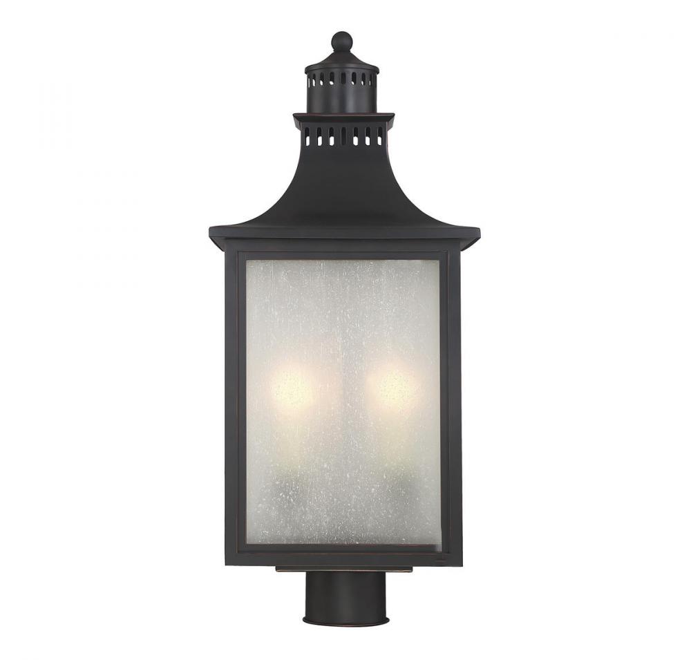 The Savoy House Monte Grande 3-light outdoor post lantern is an elegant, clean-lined version of a classic box-shaped lantern. It’s a timeless and pleasing style from designer Karyl Pierce Paxton, a wall lantern that will illuminate the exterior of your home and welcome you and your guests with a familiar, traditional aesthetic. The English bronze finish is a wonderful neutral and the panels are made of beautiful pale cream seeded glass. Three 40W candelabra size bulbs provide plenty of soft light. This lantern is 10" wide, 23.75" high and UL rated for wet locations.