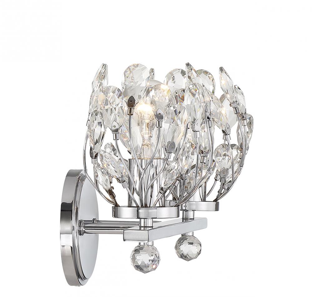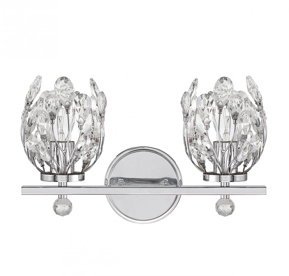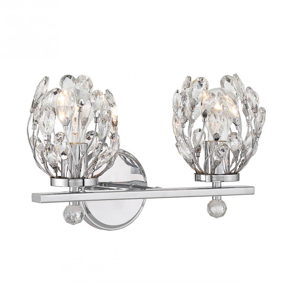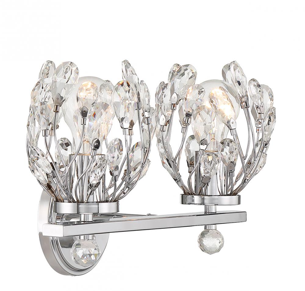 Give your bathroom its flowers with the whimsical Savoy House Moreno 2-light bath vanity light. Metal stems topped with clear crystal buds surround each light to create a look that is always fresh and fun, whether the lights are on or off. Finished in chrome. Moreno is 9.5" in height, 15.5" in width and extends 6.75" from the wall. It uses 2 standard size bulbs of up to 60 watts per bulb (bulbs not included).