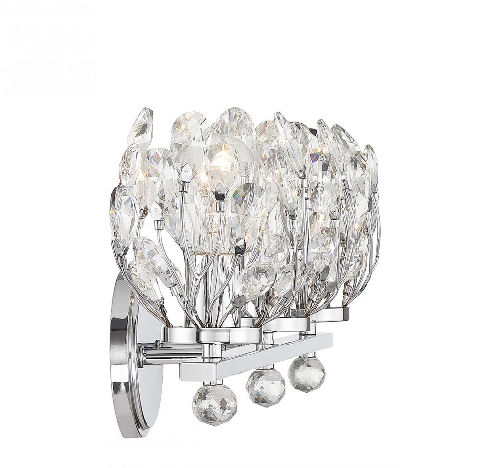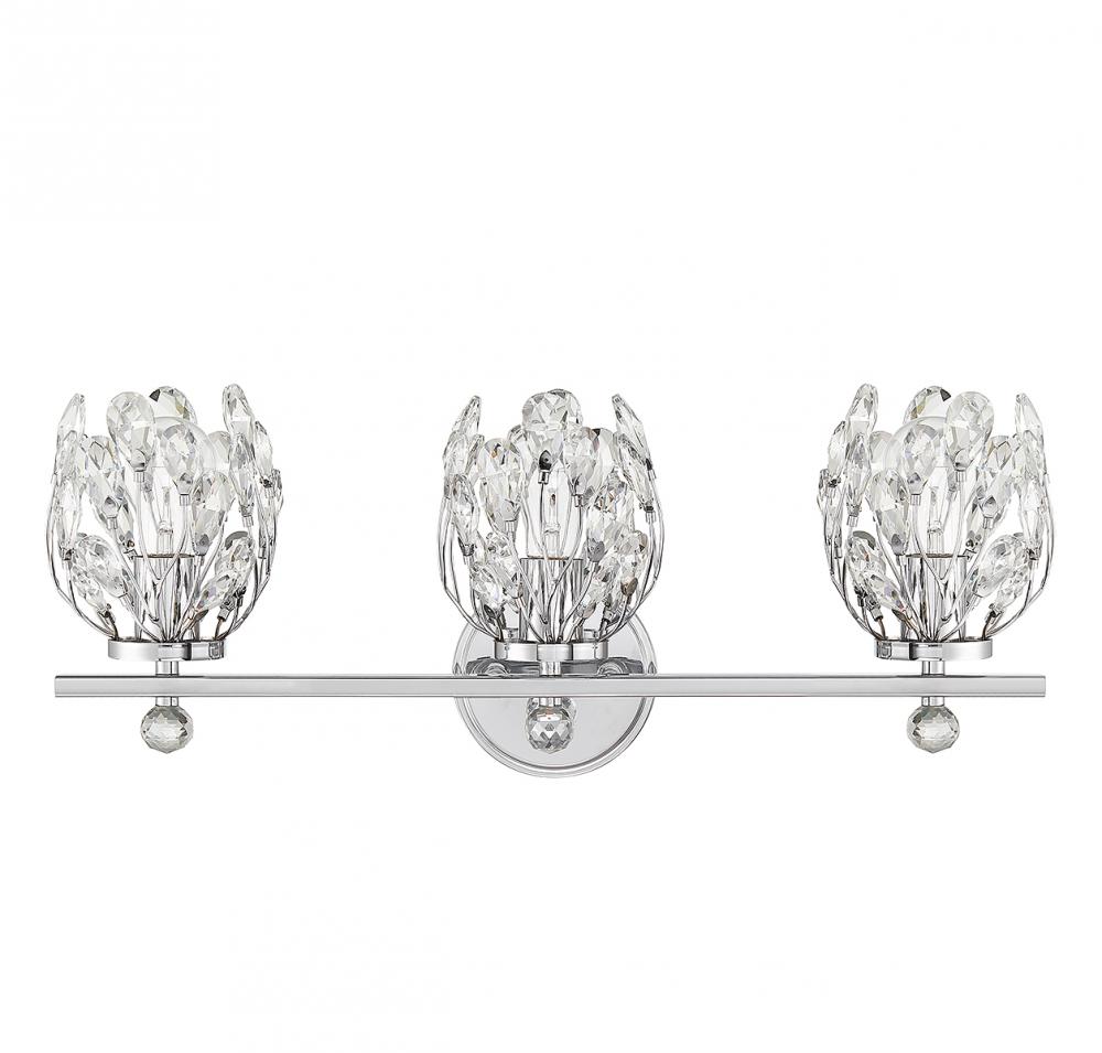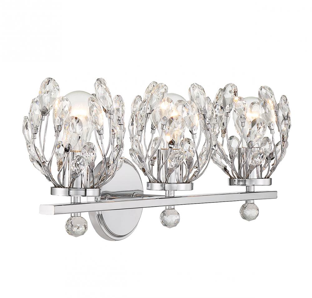 Give your bathroom its flowers with the whimsical Savoy House Moreno 3-light bath vanity light. Metal stems topped with clear crystal buds surround each light to create a look that is always fresh and fun, whether the lights are on or off. Finished in chrome. Moreno is 9.5" in height, 23.5" in width and extends 6.75" from the wall. It uses 3 standard size bulbs of up to 60 watts per bulb (bulbs not included).