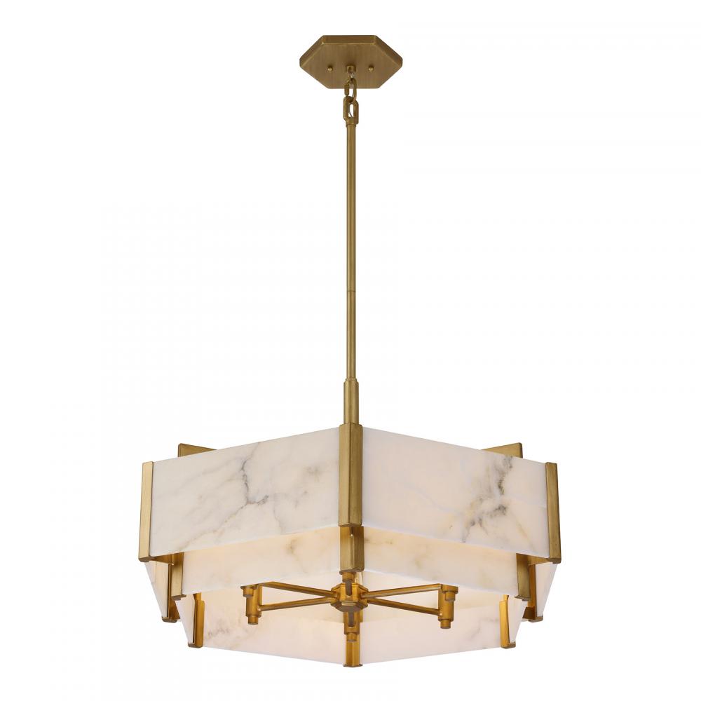 Art Deco style gets an organic twist in the Savoy House Orleans 6-light pendant. Panes of natural alabaster stone obscure the lights for a bright yet comfortable glow and are held in a jewelry-like frame that is finished in Distressed Gold. Orleans is 15.5" in height and 24.28" in width. It uses 6 candelabra size bulbs of up to 60 watts each (bulbs not included). Comes with four 12" downrods and one 6" downrod.
