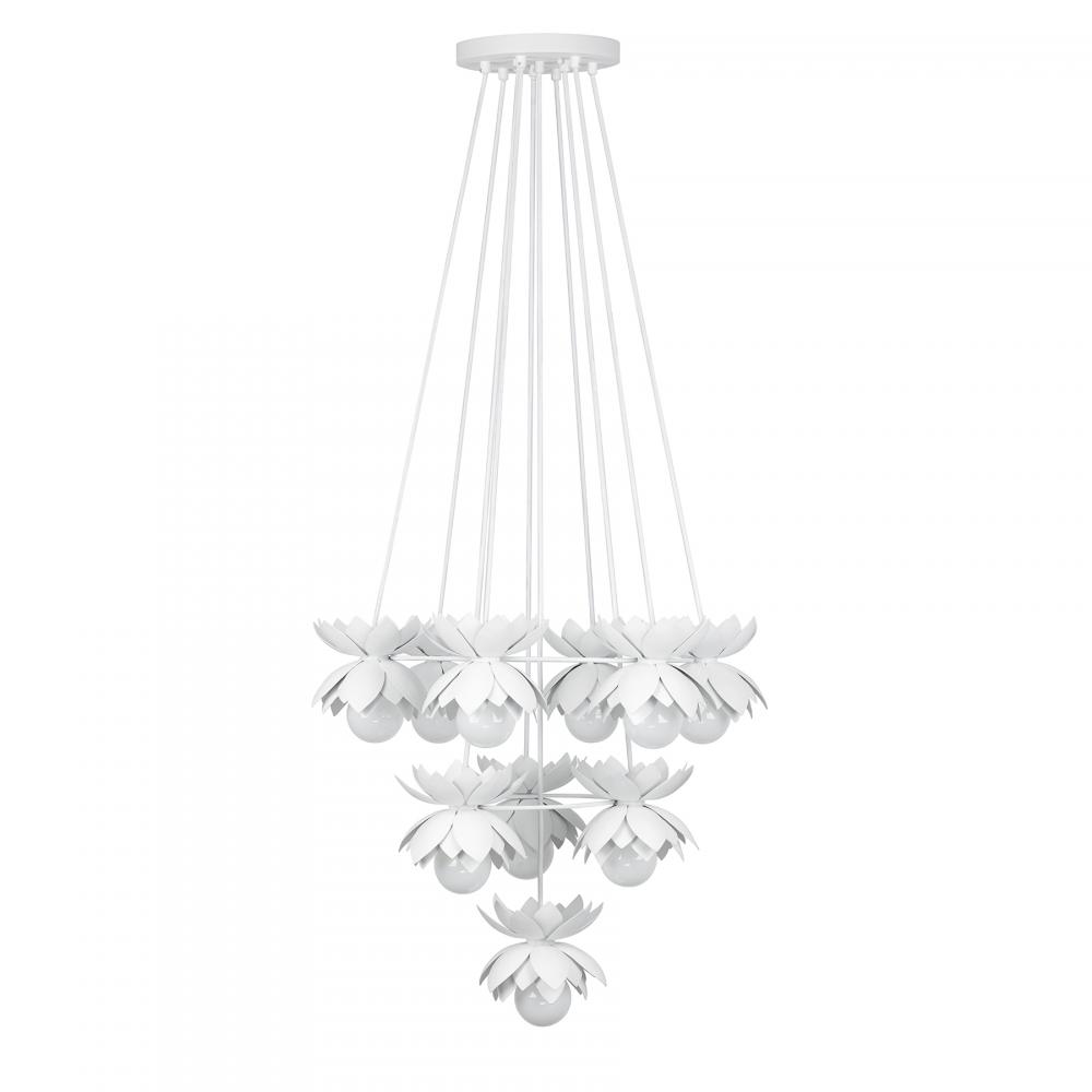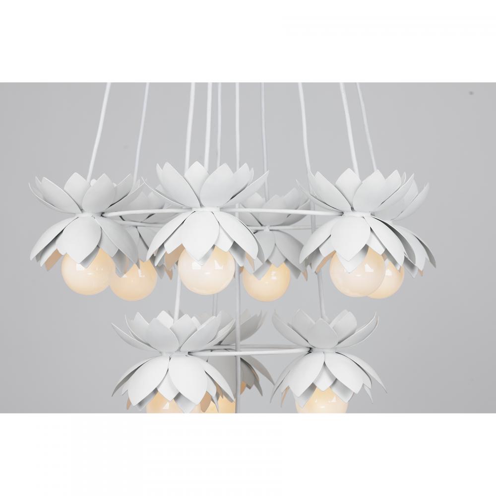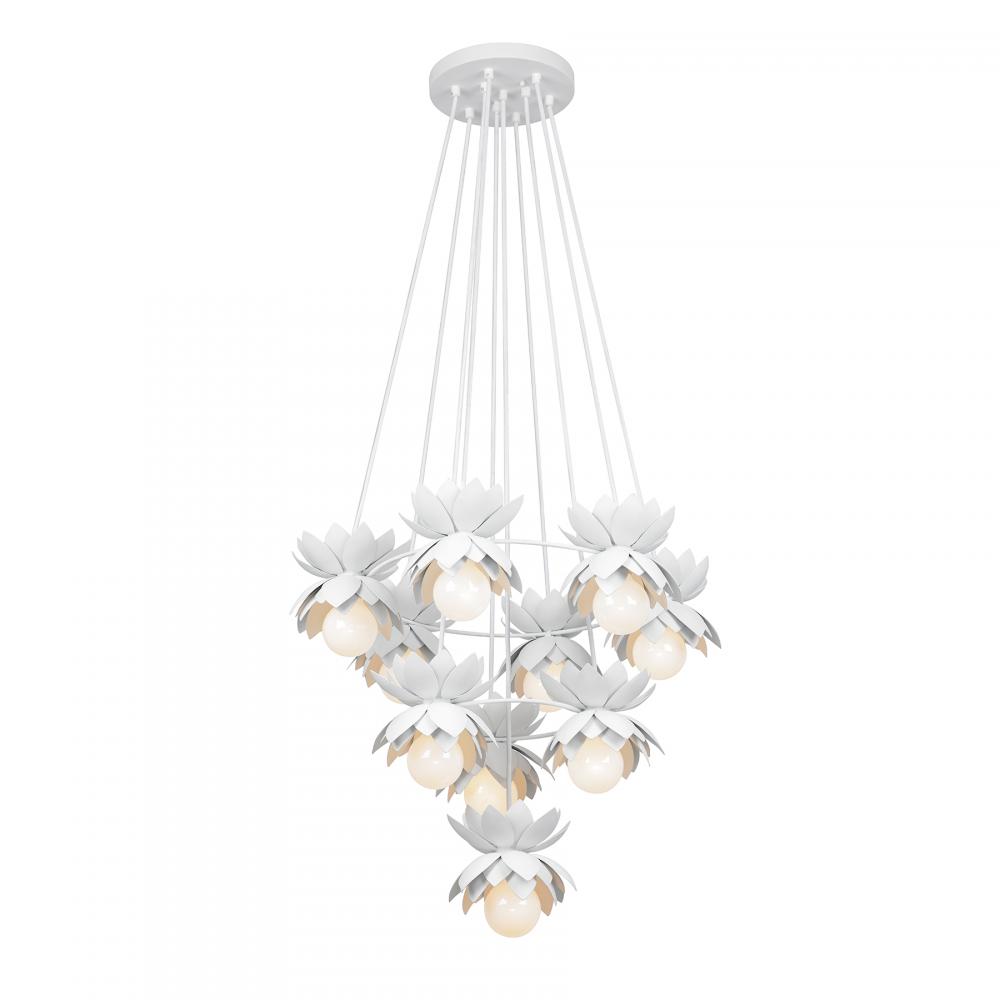 The Savoy House Pacha 10-light chandelier was designed by Breegan Jane, an award-winning interior designer and TV host. Bring some drama to your decor with the beautiful, edgy metal flowers that cascade down in three tiers. The hand-applied White Cashmere finish is boldly alluring, yet also understated. Pacha is 54" in height and 25" in width. Uses ten standard size bulbs of up to 60 watts per bulb. Bulbs not included.