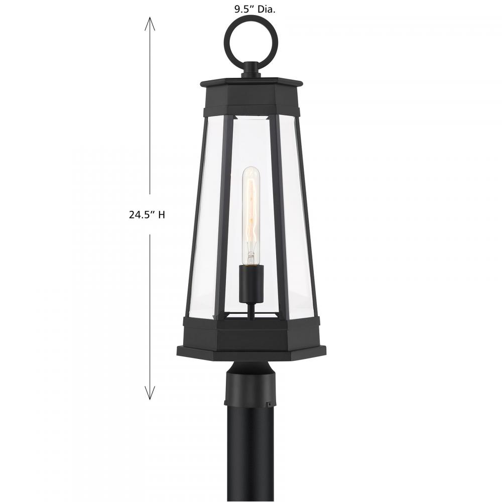 Light the way home with the terrific transitional style of the Savoy House Payne 1-light outdoor post light. It has standout style thanks to panes of clear beveled glass, thoughtful geometric detailing and a versatile Matte Black finish. Use it solo or in groupings to create a great first impression. Payne is 24.5" in height and 9.5" in width. Uses one standard size bulb of up to 60 watts. Bulb not included. Payne is wet area rated for use in covered or uncovered outdoor areas.