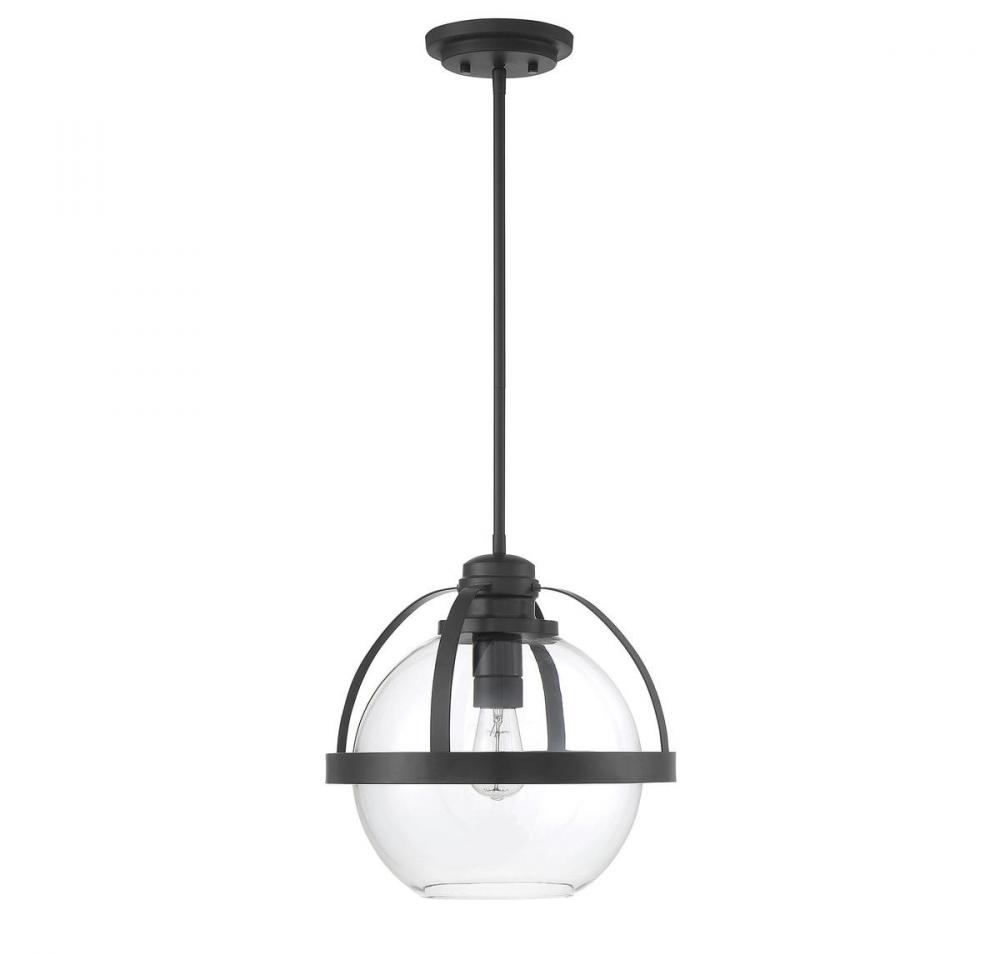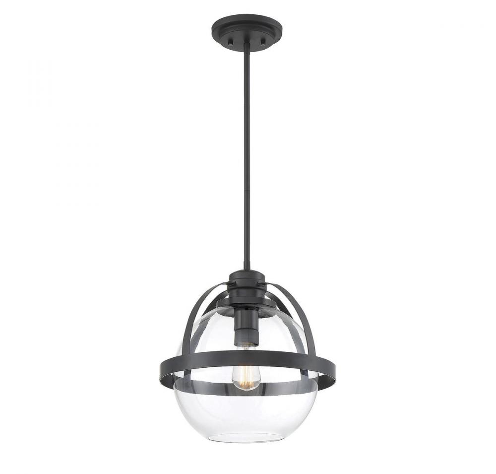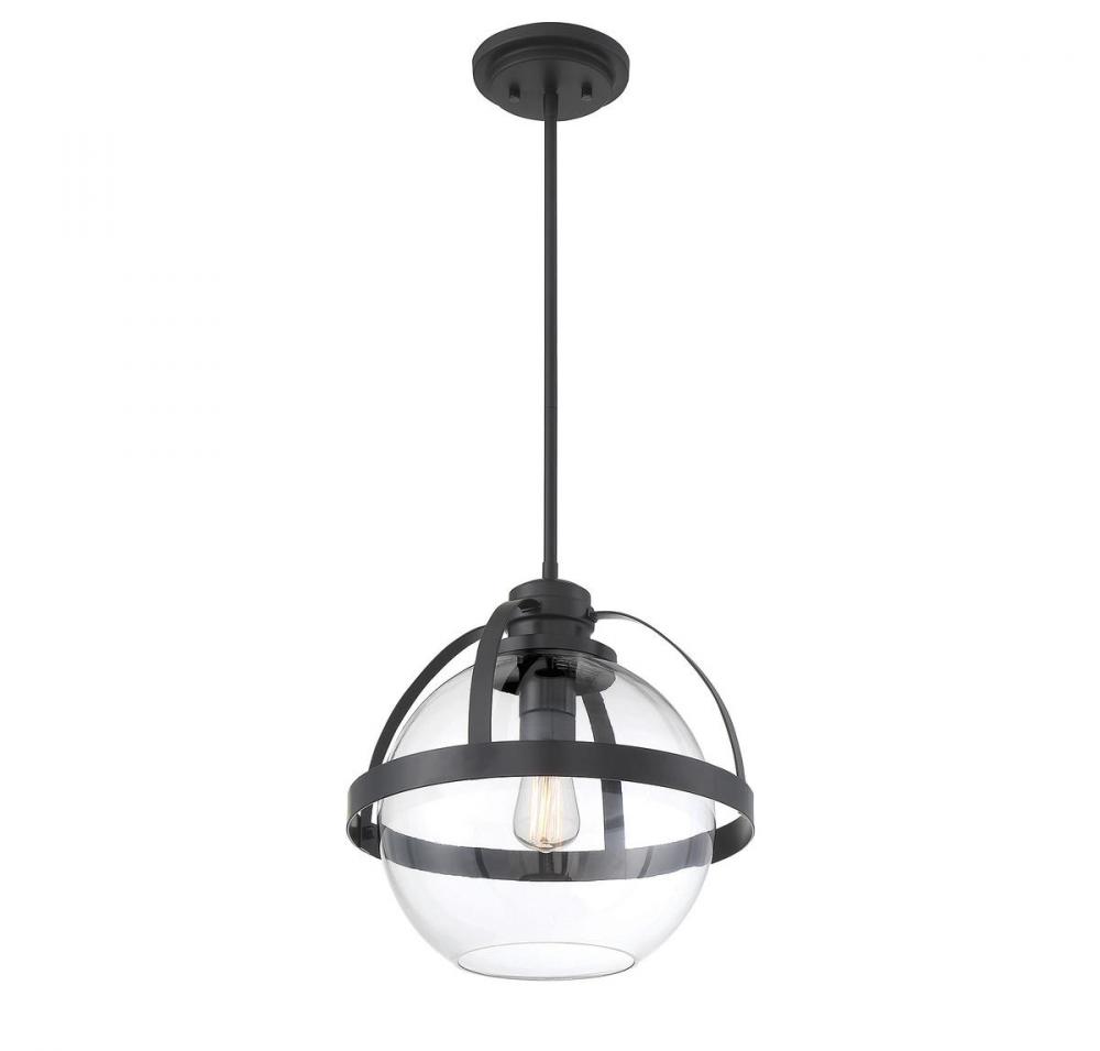 This Savoy House Pendleton 1-light pendant is a smart way to pep up the illumination and style in any room. It showcases a large orb of clear glass that is open at the bottom, allowing for more direct light and making it easy to replace the bulb. Metal bands bisect the shade and help hold it to the fixtureï¾’s base. Try using this fixture in kitchens, foyers, bedrooms and home offices, though truly the possibilities are endless. Finished in matte black. This fixture is 14" wide and has an adjustable height that ranges from 23.5" to 42.5". Uses a standard size bulb of up to 60 watts (not included).