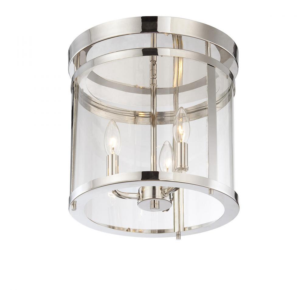 This sleek, cylindrical Penrose 3-light ceiling semi-flush mount from Savoy House is an excellent choice for lovers of stylish modern design. It features clear glass and is finished in shining polished nickel. Semi-flush mounts can be used on the ceiling of pretty much any interior room, including foyers, hallways, stairways, closets, bedrooms, kitchens and more! Bulbs not included. Try using stylized bulbs for a different look! The polished nickel finish can be matched with nickel hardware or mixed with hardware in other finishes. Bring Penrose into rooms of any style, especially transitional or classic, for a big touch of lighting allure. When you choose a Savoy House lighting fixture, you can be certain you've selected a piece that will withstand the test of time.