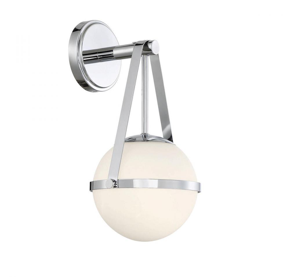 This Savoy House Polson 1-light wall sconce showcases a chic take on midcentury modern style inspiration. Its opal etched glass orb is held in place by a slender rod as well as a central band and metal strap around the arm. Finished in polished chrome. Polson is 15.5" in height, 8" in width and extends 8" from the wall. It uses one standard size bulb of up to 60 watts. Damp area rated.