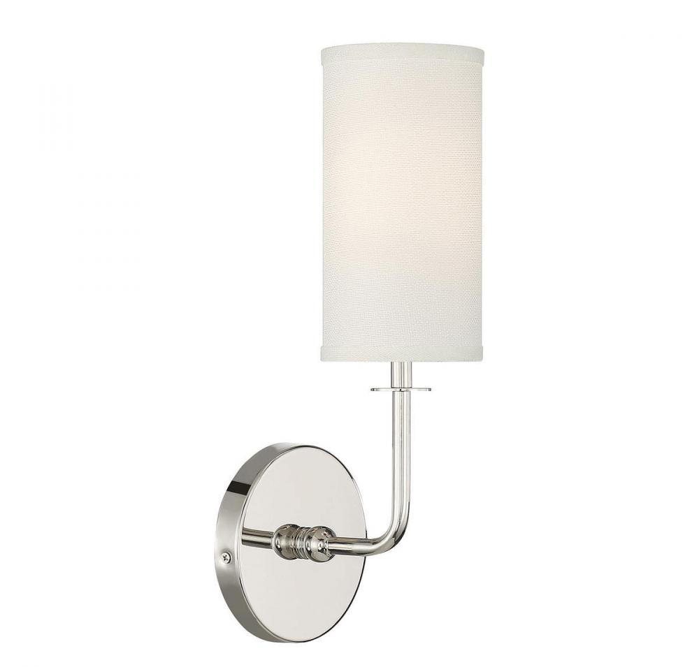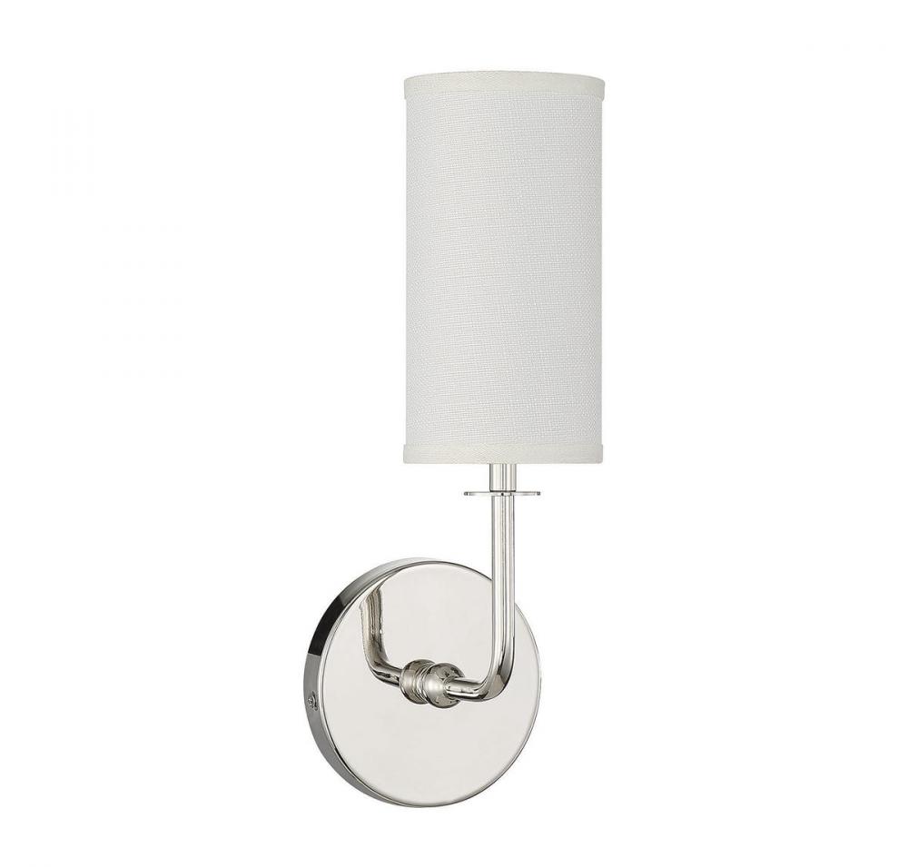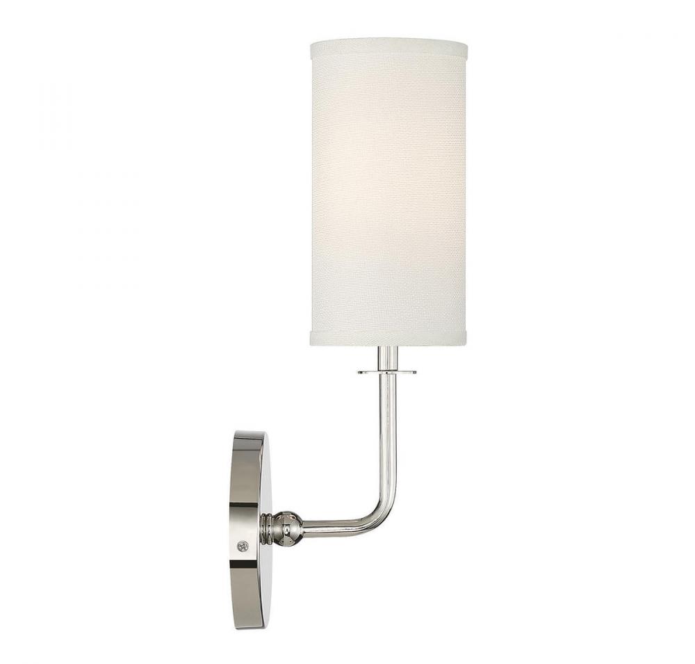 With the Savoy House Powell 1-light sconce, get simply chic lighting that will add a touch of brightness in any room. Use Powell solo or in groupings to meet any accent lighting need throughout the house! The tall cylindrical shade of white fabric pairs nicely with the effortlessly curving arm and polished nickel finish. Powell is 15" in height, 5" in width and extends 5.5" from the wall. It uses one candelabra size bulb of up to 60 watts. Damp area rated.