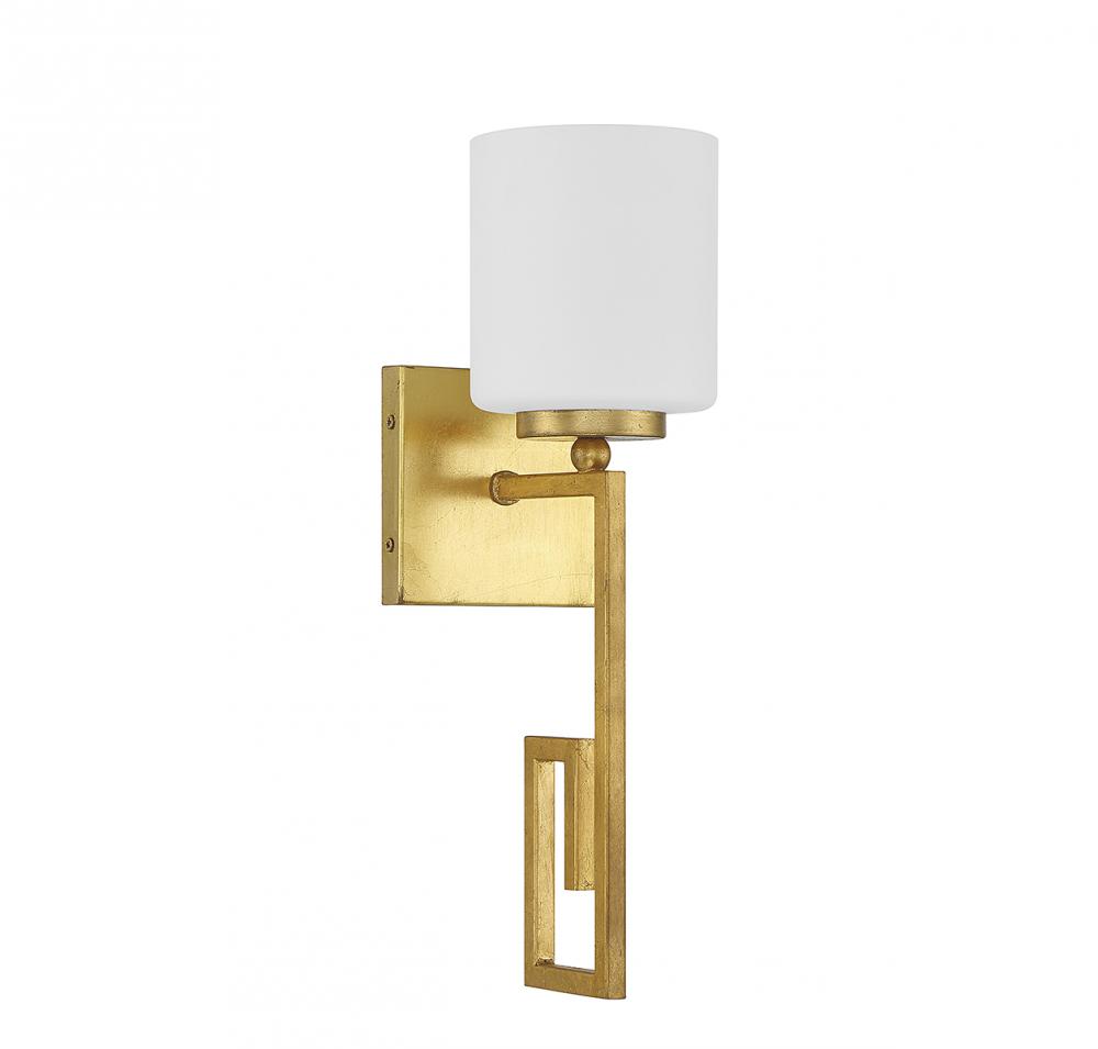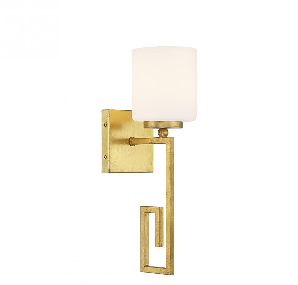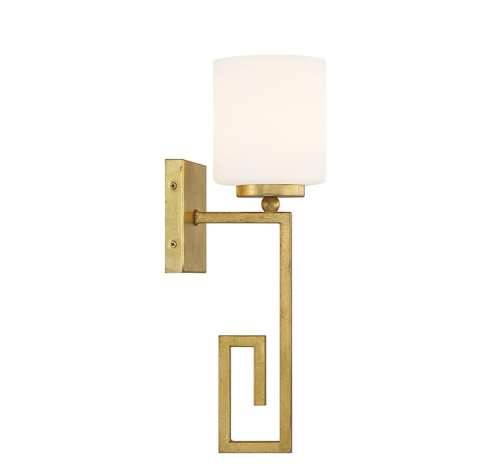 Bring a touch of Mediterranean magic to any space with the Savoy House Quatrain 1-light sconce! It showcases Greek key detail, a white opal glass shade and a beautifully textured True Gold finish that recalls gold leaf. Quatrain is 16.25" in height, 4.75" in width and extends 6.25" from the wall. It uses 1 standard size bulb with a max of 60 watts (bulb not included).