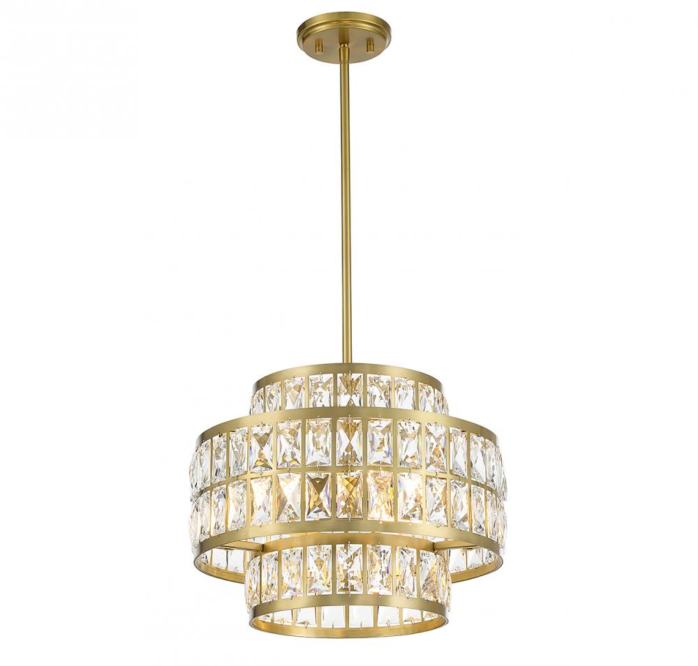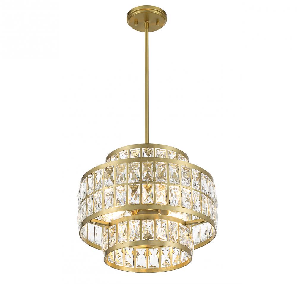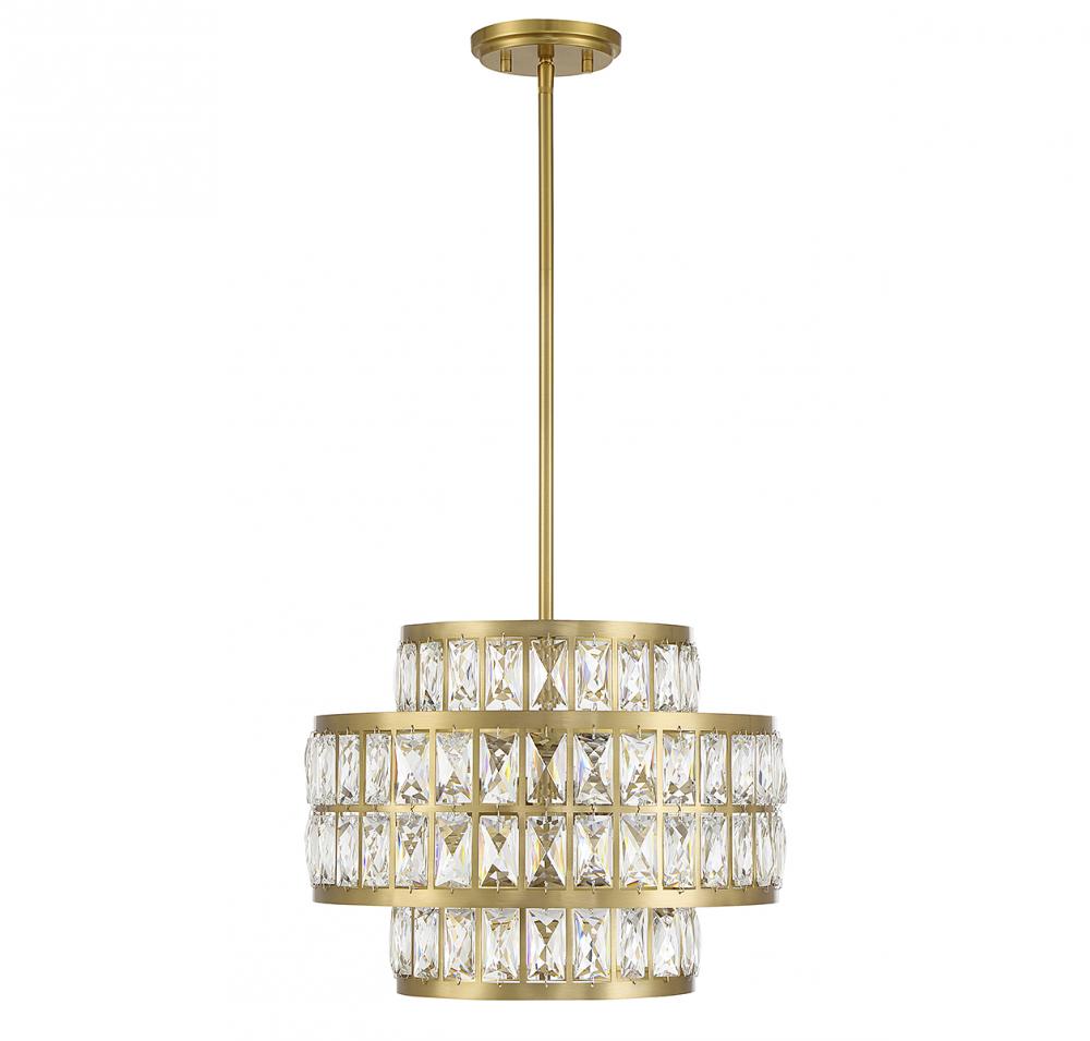 It is often said that lighting is the jewelry of the home and the Savoy House Renzo 3-light pendant is a perfect example of this saying. Faceted clear crystal decorates the two layers of shades, which overlap in an intriguing way and are finished in warm brass. Renzo is 16" in width and has an adjustable height ranging from 18" to 66". Comes with four 12" downrods and one 6" downrod. It uses 3 standard size bulbs of up to 60 watts per bulb (bulbs not included).