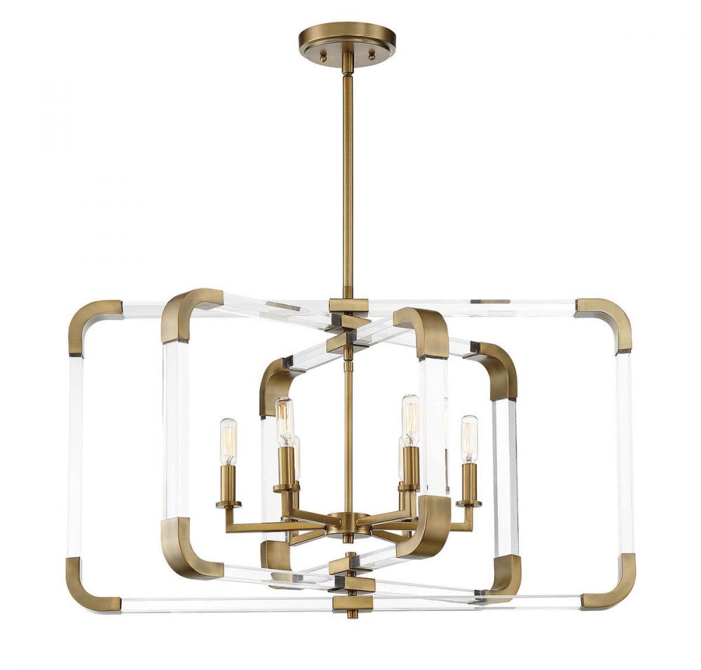 Geometric and eye-catching, this Rotterdam 6-light pendant from Savoy House features curving, intersecting open rings of clear acrylic highlighted with hardware detailing in a rich warm brass finish. The open rings can be rotated to customize the look. You can hang this pendant from a sloped ceiling and its hanging height is adjustable. Pendants are very versatile and can be used in many different indoor spaces, including kitchens, foyers, offices, great rooms, bedrooms and even bathrooms. Since the bulbs are exposed, try using stylized bulbs for a different look! The warm brass finish can be matched with brass hardware or mixed with hardware in other finishes. Rotterdam is perfectly suited for transitional, contemporary and glamorous style spaces. When you choose a Savoy House lighting fixture, you can be certain you've selected a piece that will withstand the test of time.