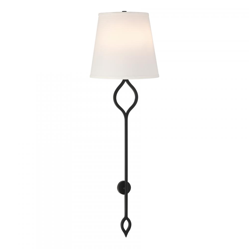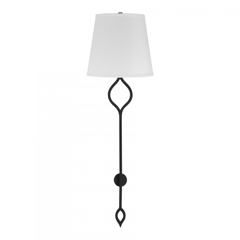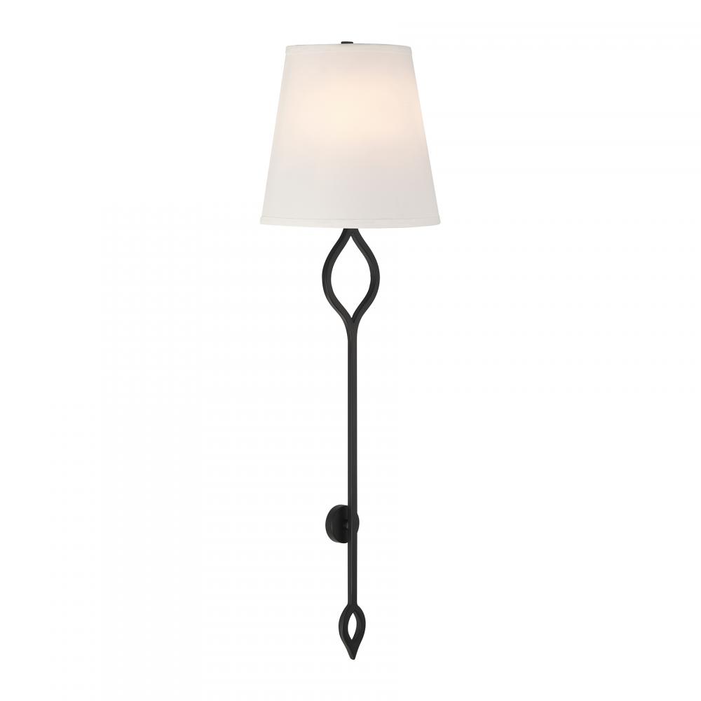 Add a stately lighting look to any space with this Savoy House Roxbury 2-light sconce. Its arm, finished in Matte Black, showcases thoughtfully placed detailing that contrasts nicely with the white fabric shade. Roxbury is 31.5" in height, 9.5" in width and extends 6" from the wall. Uses two candelabra size bulbs of up to 60 watts per bulb. Bulbs not included. This sconce is damp area rated.