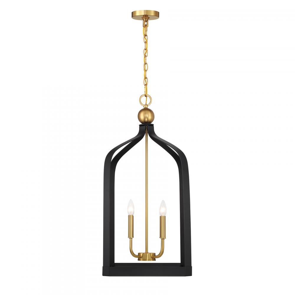 The Savoy House Sheffield 4-light pendant offers up a beautiful, elegant and classic look with a lantern-like style, airy openness and a Matte Black finish with Warm Brass accents. It is 32" in height and 15" in width. It uses four candelabra size bulbs of up to 60 watts per bulb. Bulbs not included.