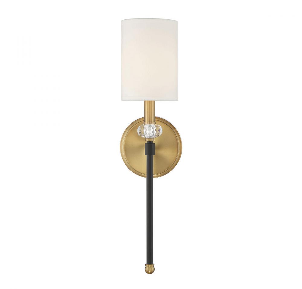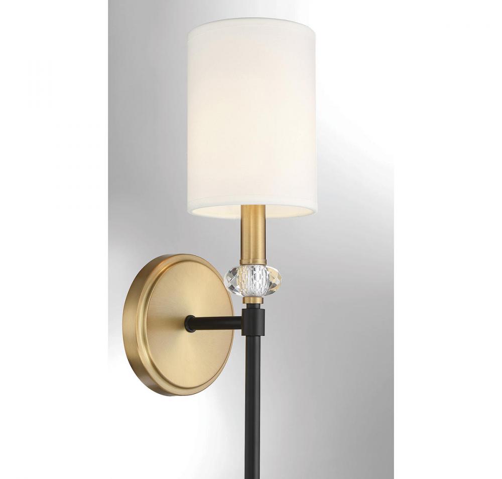 The Savoy House Tivoli 1-light wall sconce has a whimsical yet glamorous look that is truly perfect for today's homes. A long and slender stem is topped with a white fabric shade and decorated with a faceted crystal bauble. Finished in a beautiful two-tone matte black with warm brass accents. Tivoli is 19" in height, 5" in width and extends 6" from the wall. It uses one candelabra size bulb of up to 60 watts. Damp area rated.