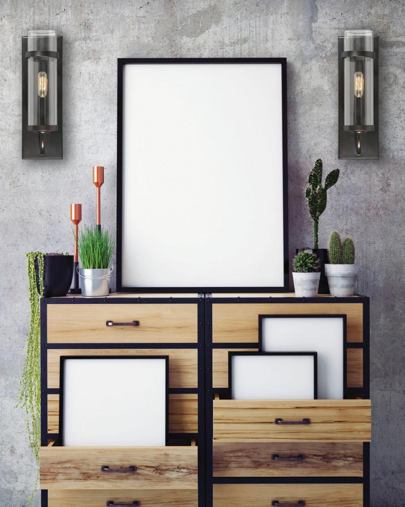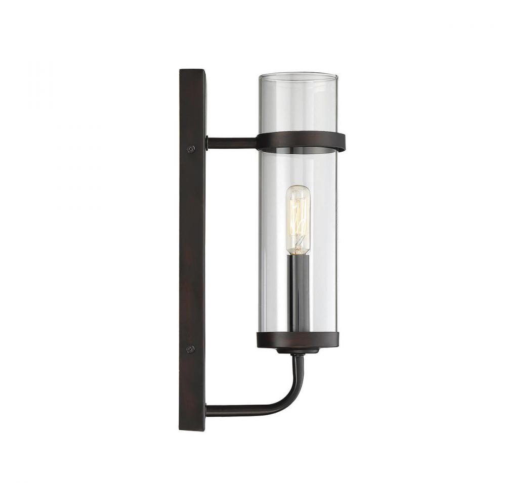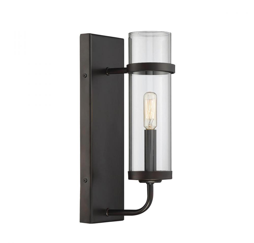 The Savoy House Tulsa 1-light wall sconce has sleek, casual style with a touch of an industrial-inspired aesthetic. A tall, rectangular wall plate supports one curved light arm that holds a metal candle cover. This frame has a solid, understated practicality and a rich, dark English bronze finish. The light arm holds a slim cylindrical shade made of pristine clear glass, allowing one 60W candelabra size bulb to illuminate the area. Using a visible filament or Edison bulb will add to the vintage, utilitarian appeal. The sconce measures 4.75" wide, 13.75" high, and extends 6.25" from the wall, a superb size to put comfortable, industrial chic style along the walls of your dining room, kitchen, living room, entryway, family room, office, bedroom, hallway or great room.