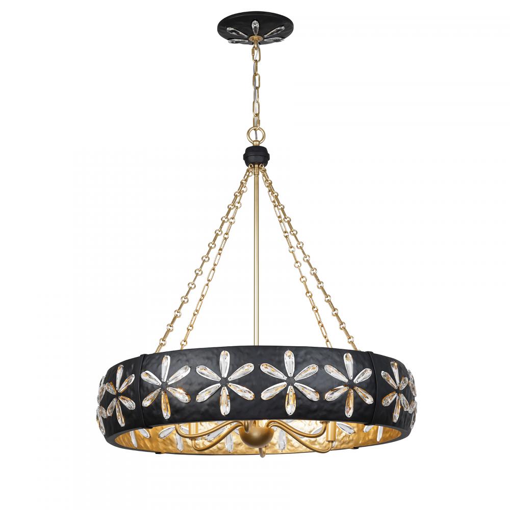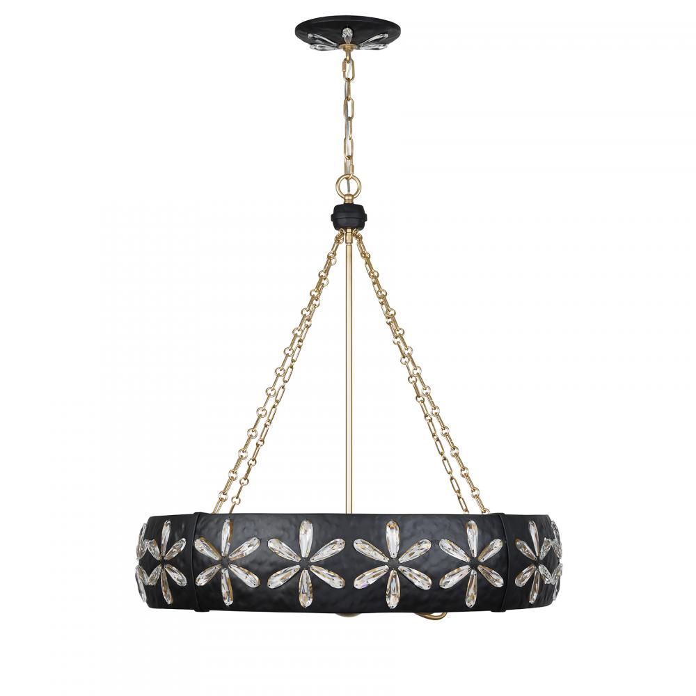 The Savoy House Venice 6-light chandelier was designed by Breegan Jane, an award-winning interior designer and TV host. It is a fabulously fashionable example of her belief that lighting is the crown jewel of design. Venice is like a beautiful bangle bracelet, crafted from hammered metal and adorned with petals of faceted crystal. The ceiling canopy also features these pretty petals! The Metropolis Black finish on the outside and Gold finish on the inside are both hand-applied. Venice is 6.5" in height and 30" in width. Comes with 120" of chain. Uses six candelabra size bulbs of up to 60 watts per bulb. Bulbs not included.