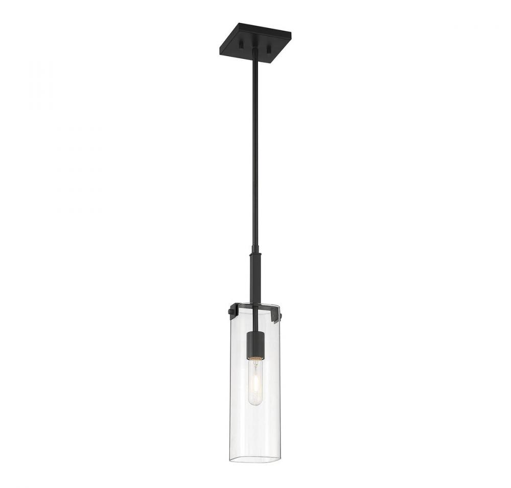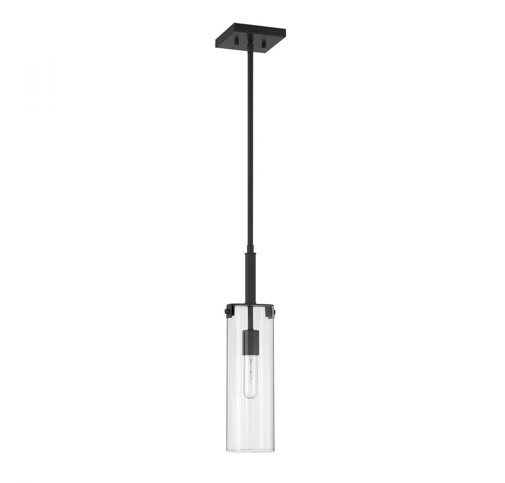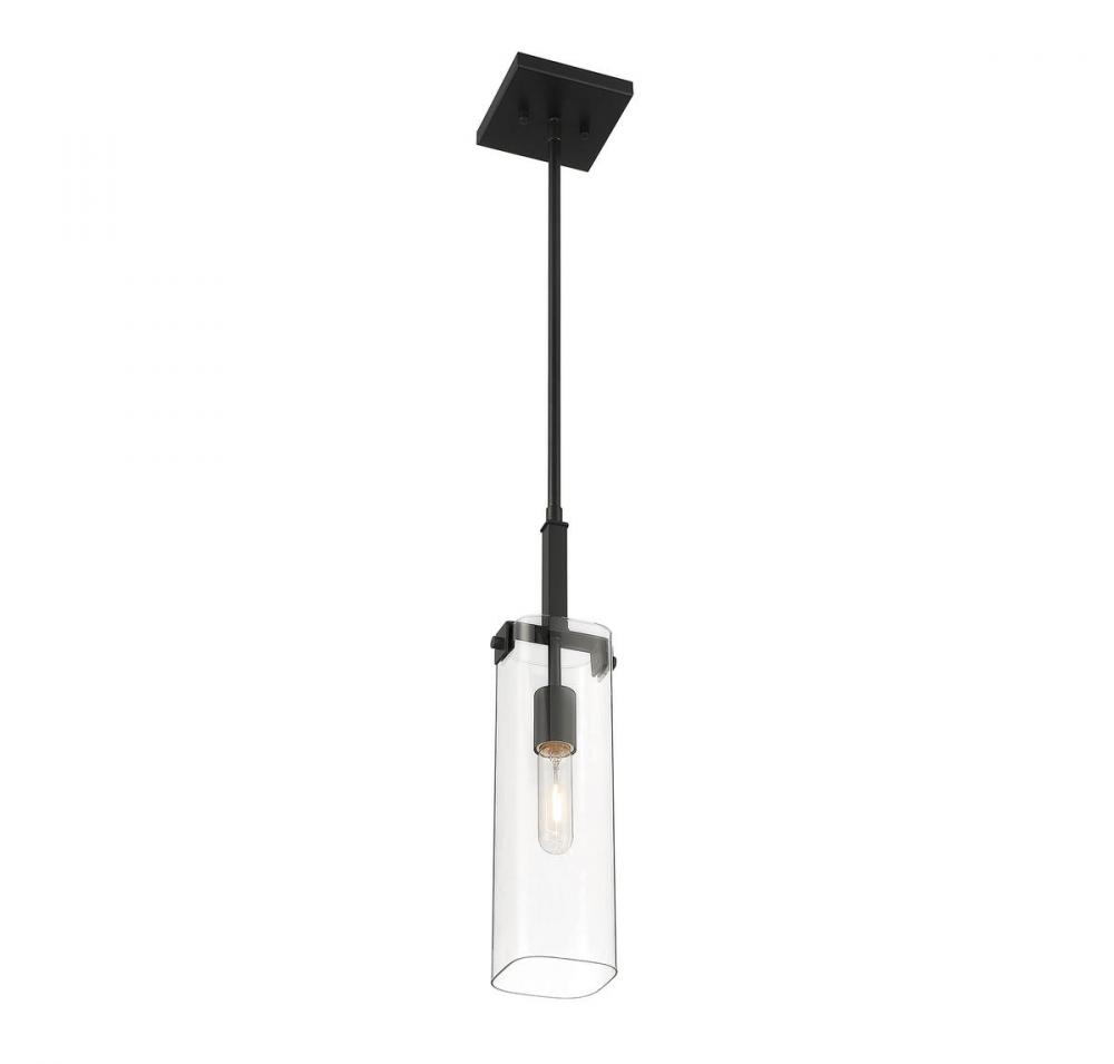 This Savoy House Winfield 1-light mini pendant showcases a bold, slim look with a shade of clear glass, thoughtful minimal detailing and a matte black finish. It is 5.13" in width and has an adjustable height ranging from 25.25" to 44.25". It uses one standard size bulb of up to 60 watts. Comes with three 9.5" downrods.