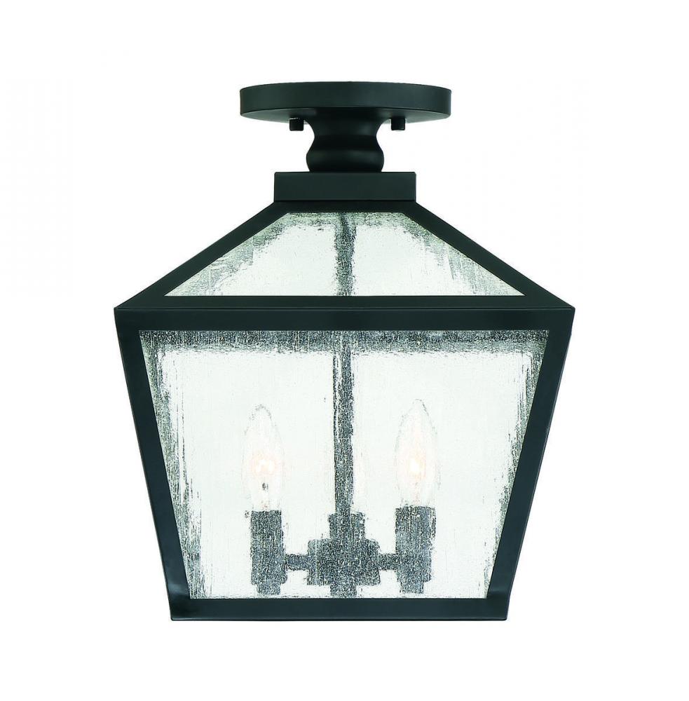 The traditional charm of vintage lanterns blends beautifully with streamlined, contemporary appeal in this Savoy House Woodstock 3-light outdoor ceiling light. Everyone who enters your home will feel welcomed and appreciate its classic style. Finished in matte black with clear seeded glass panes that add wonderful textural interest. The 14" high by 12" wide size makes it perfect to place this light on an outdoor ceiling, such as a porch, entry, covered patio or sunroom. Uses 3 candelabra size bulbs of up to 60 watts each. Damp area rated.