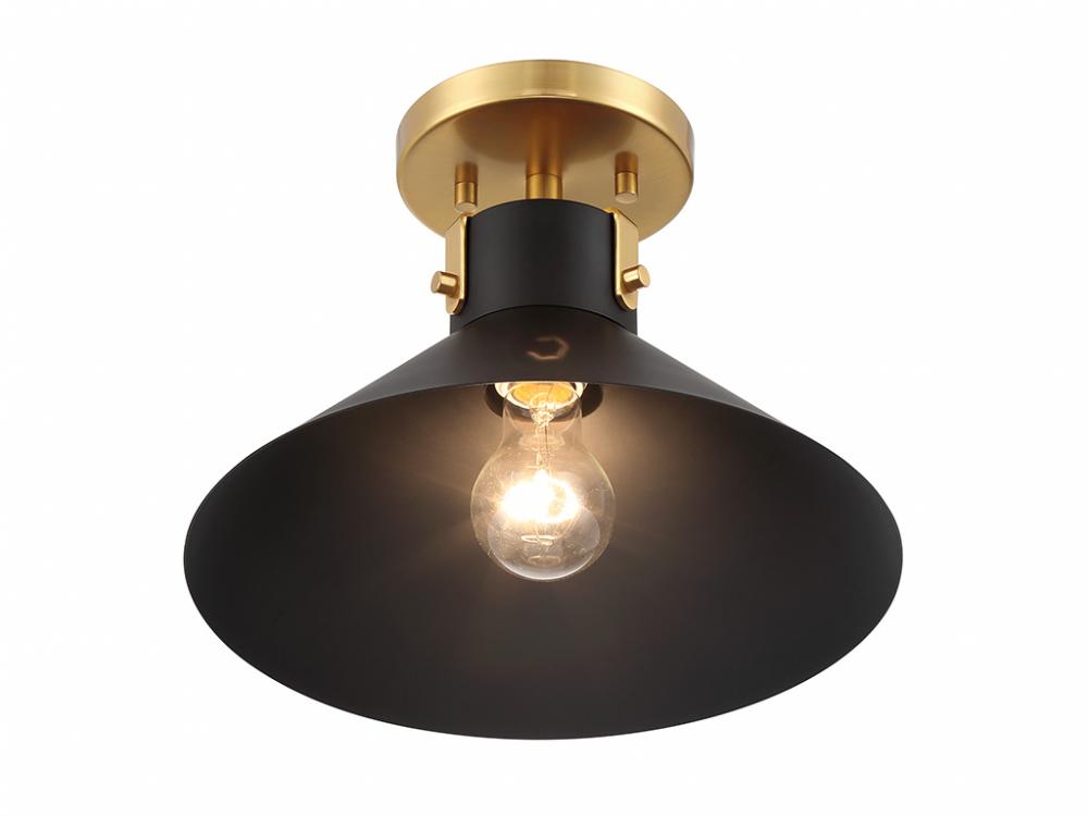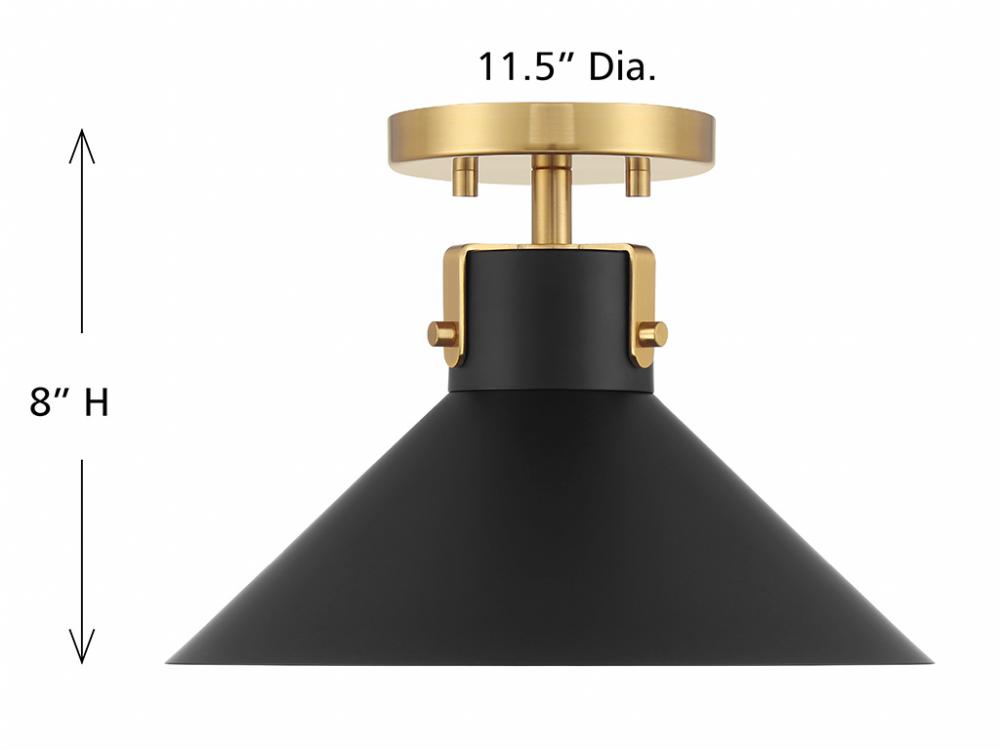 This 1-light ceiling semi-flush mount offers up big style in a small package. Brightening up any room, even cozier spaces like closets and laundry rooms, is a snap with this crisp combination of a metal shade finished in Matte Black and hardware finished in Natural Brass. The opaque shade will concentrate and direct the light. This fixture is 8" in height and 11.5" in width. It uses 1 standard size bulb of up to 60 watts. Bulb not included.