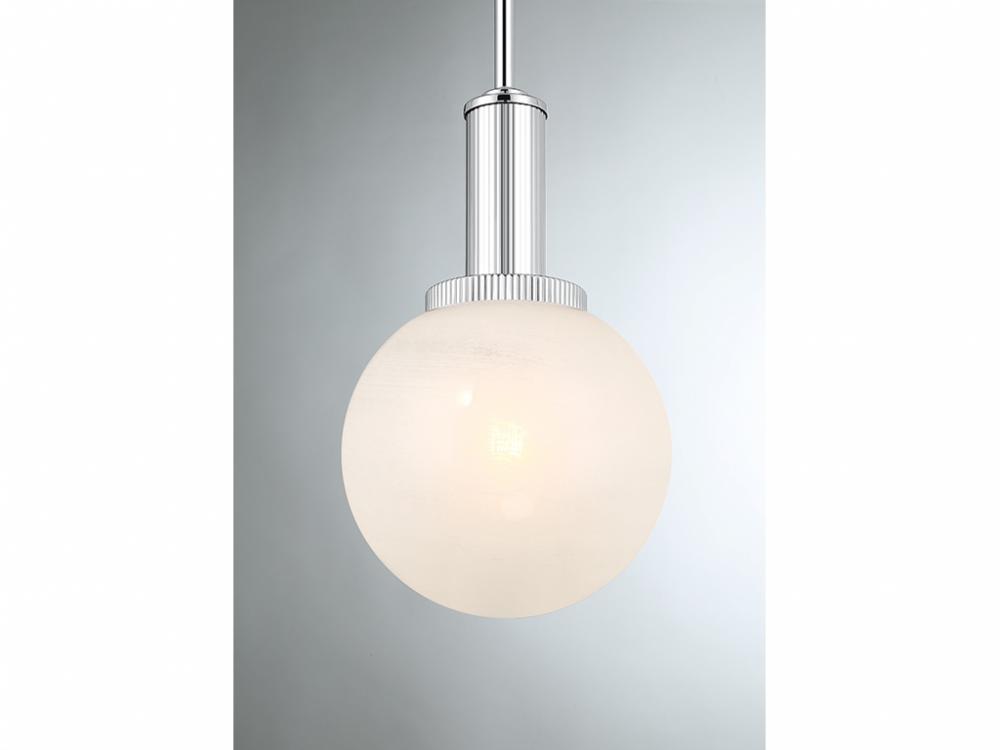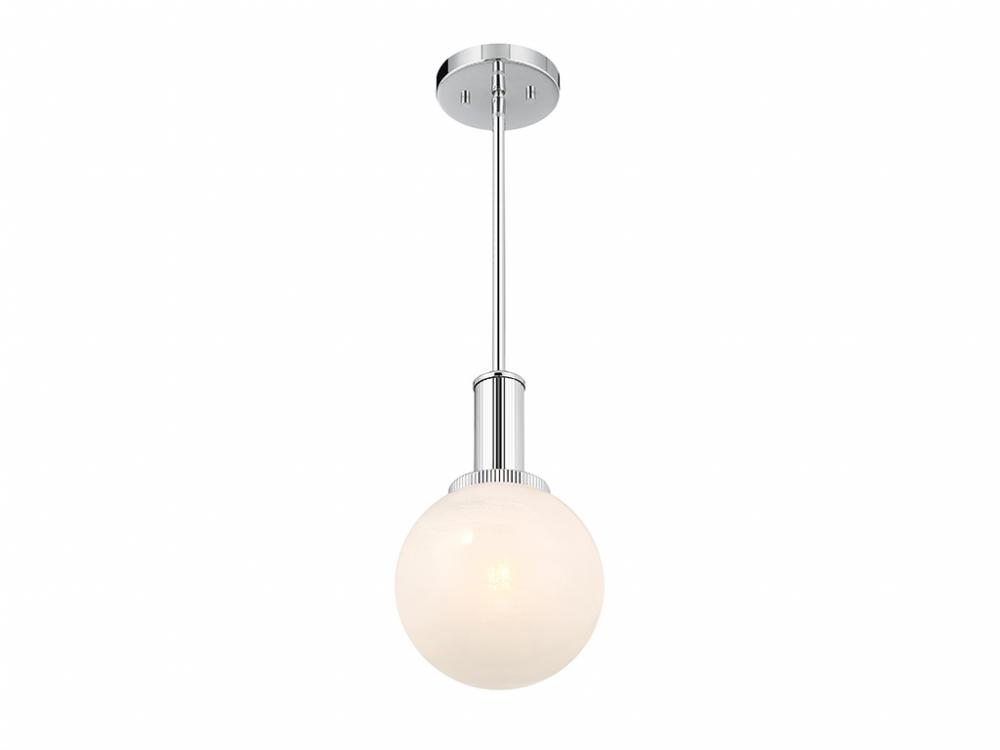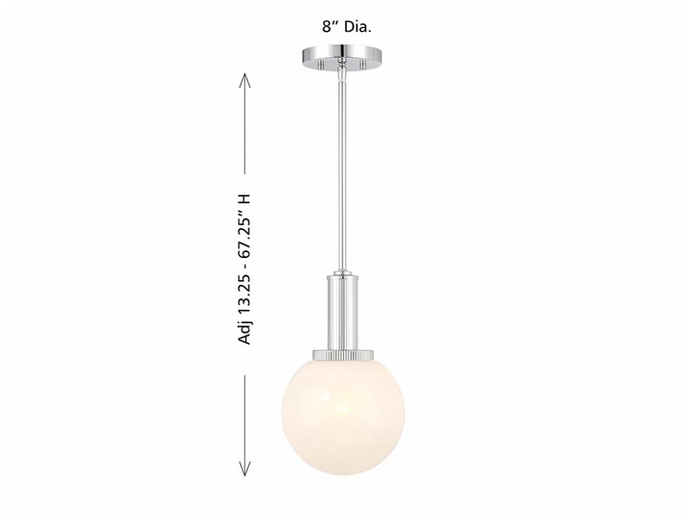 Add a little touch of magic to any room with this 1-light pendant. Its streamlined design allows a beautiful orb of strie glass to take center stage. The glass features dazzling swirls that draw the eye, soften the glow and work beautifully with the Chrome finish. Adjustable height ranges from 13.25" to 67.25". Comes with four 12" downrods and one 6" downrod. 8" width. Uses 1 standard size bulb of up to 60 watts. Bulb not included.