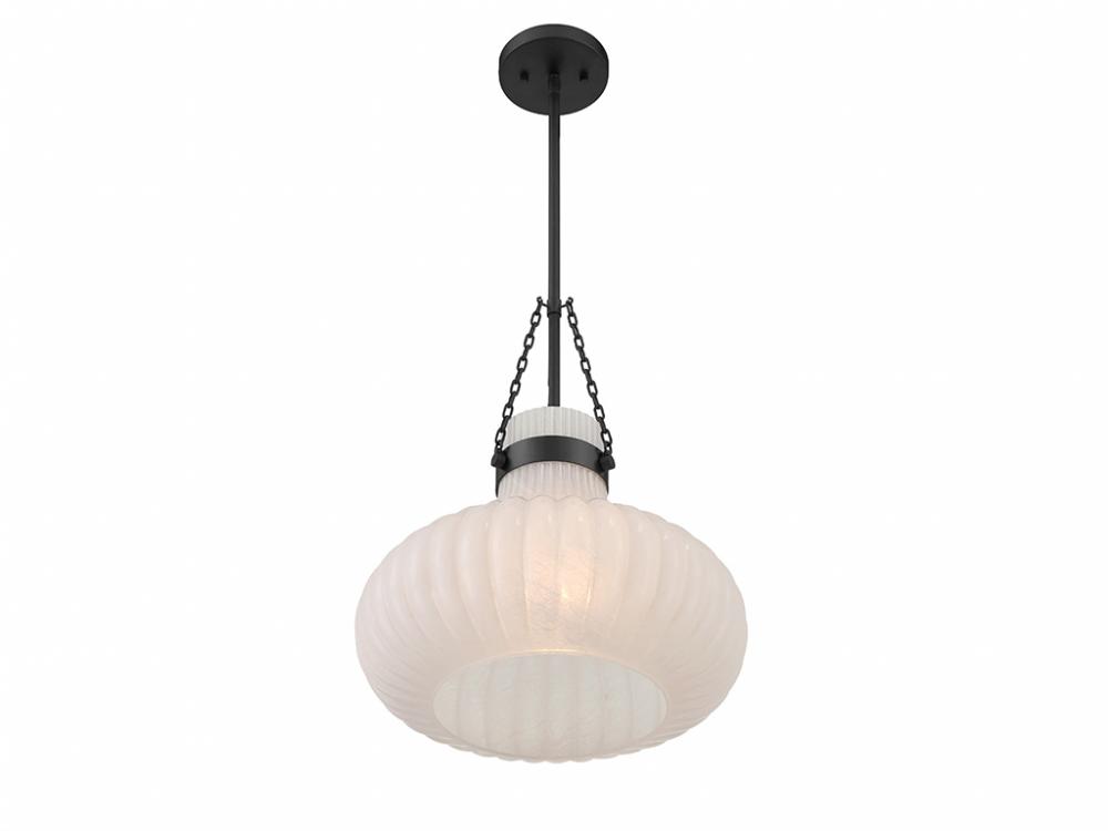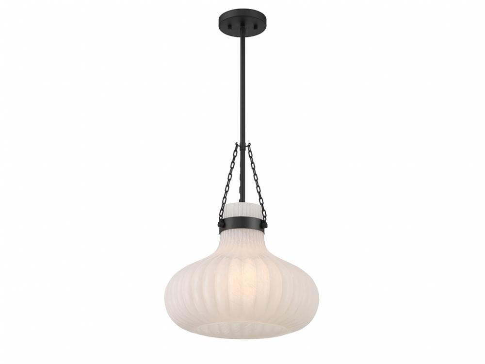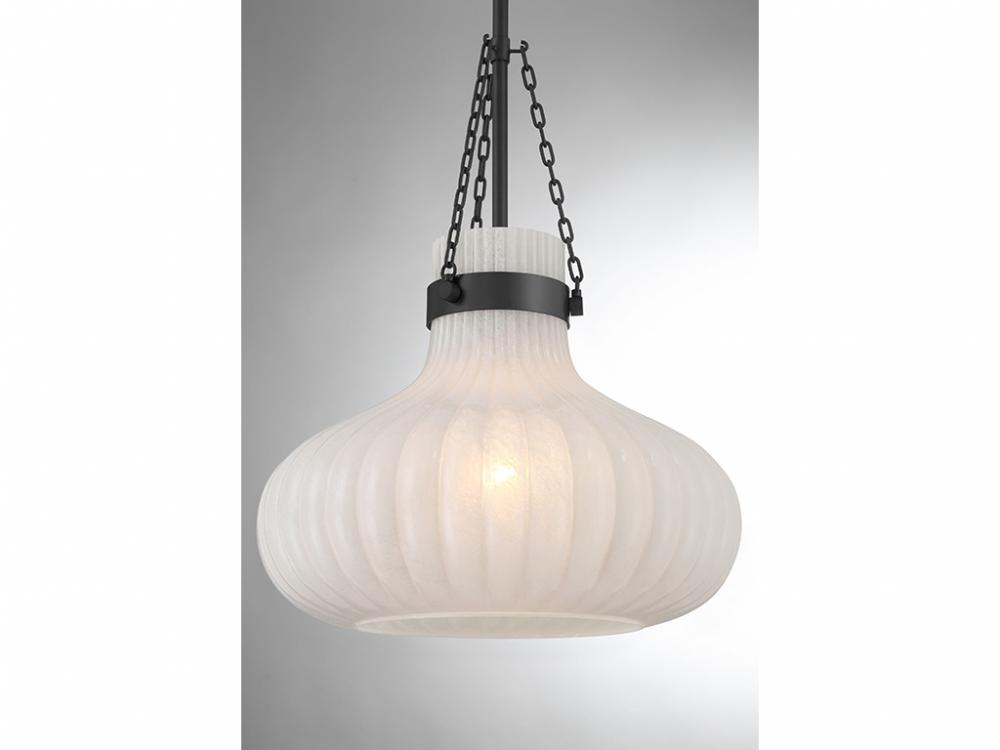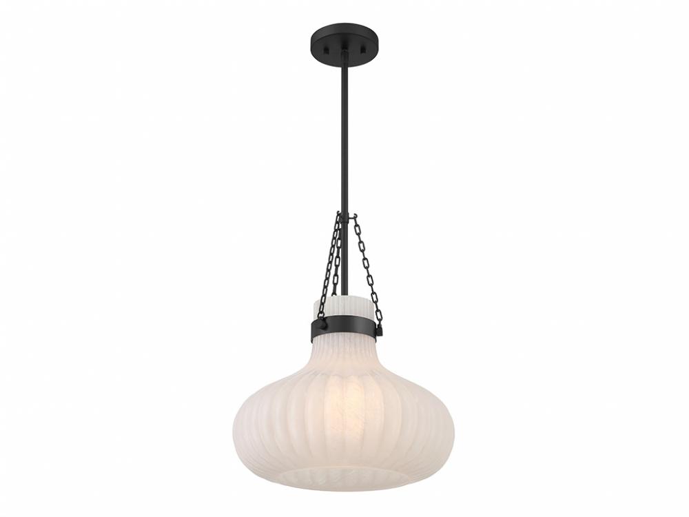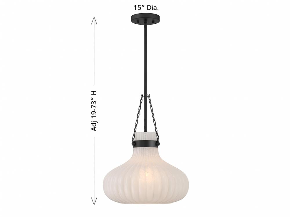 Traditional style lighting is given an ethereal upgrade in this beautiful 1-light pendant. Its fluted ribbed glass shade is made from strie glass featuring dazzling swirls that draw the eye, soften the glow and work beautifully with the Matte Black finish. This pendant is 15" in width and has an adjustable height ranging from 19" to 73". Comes with four 12" downrods and one 6" downrod. Uses one standard size bulb of up to 60 watts. Bulb not included.