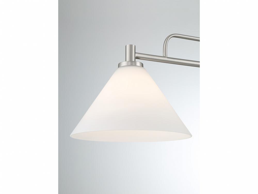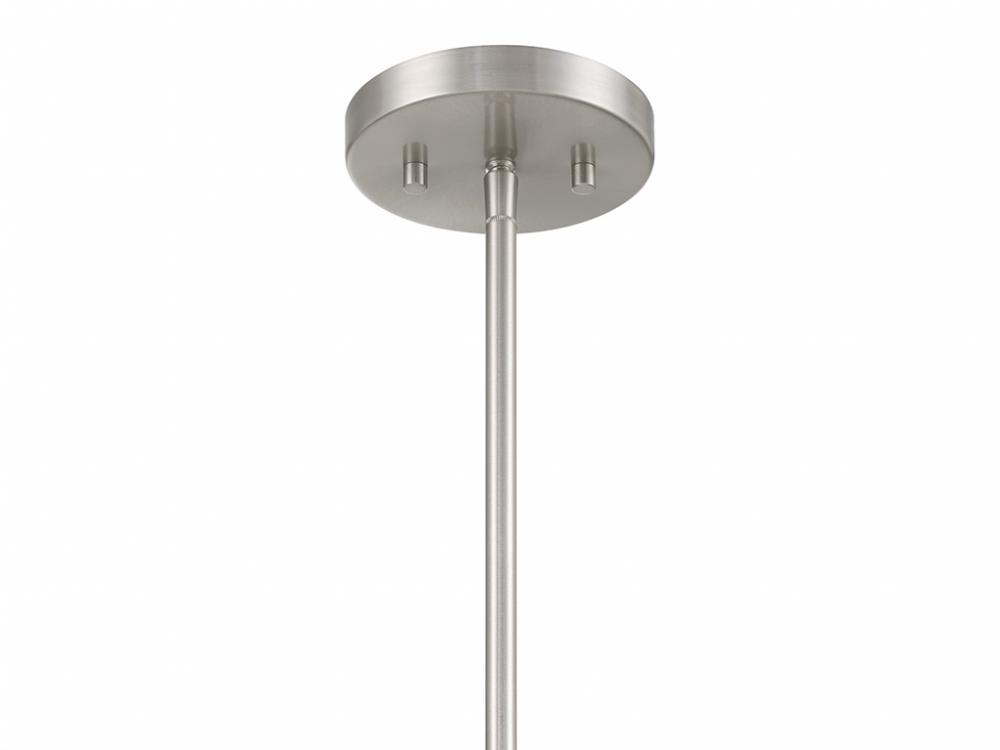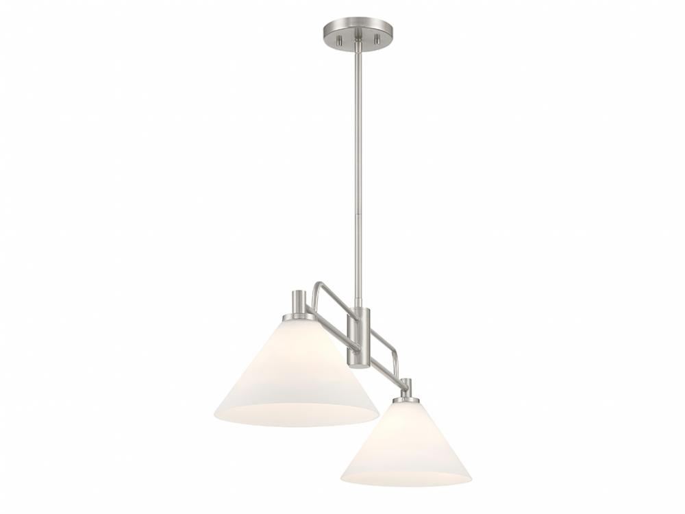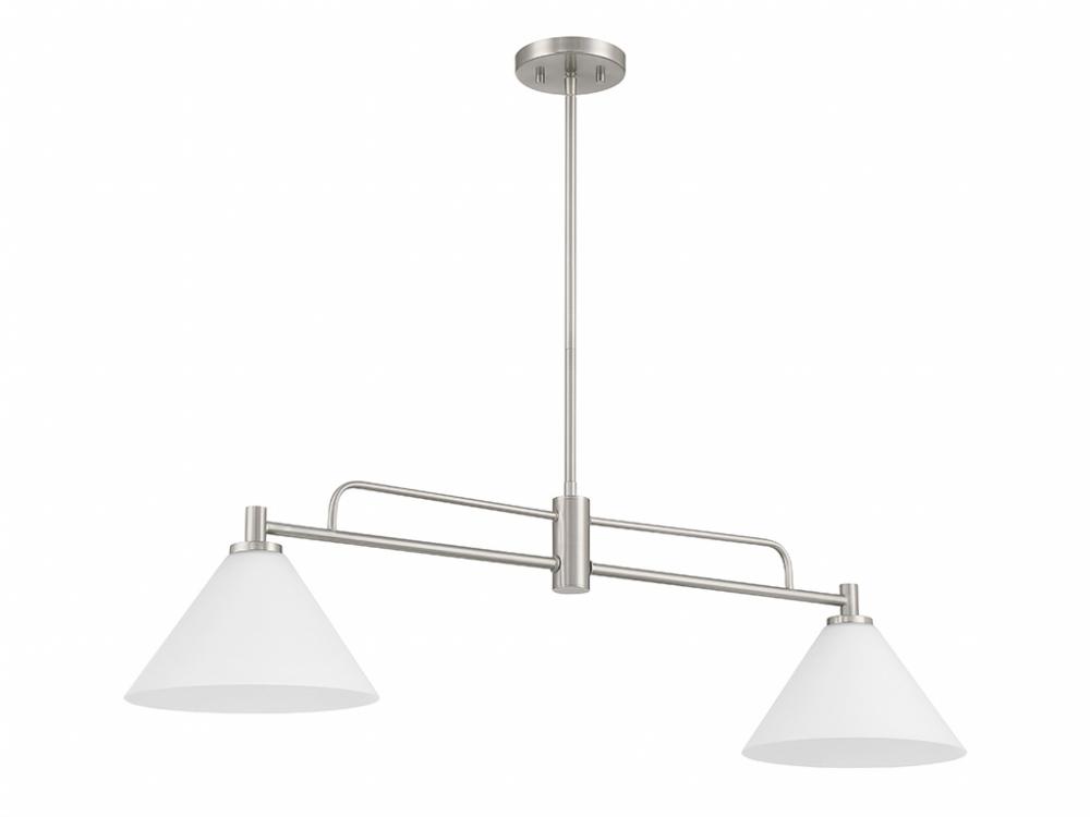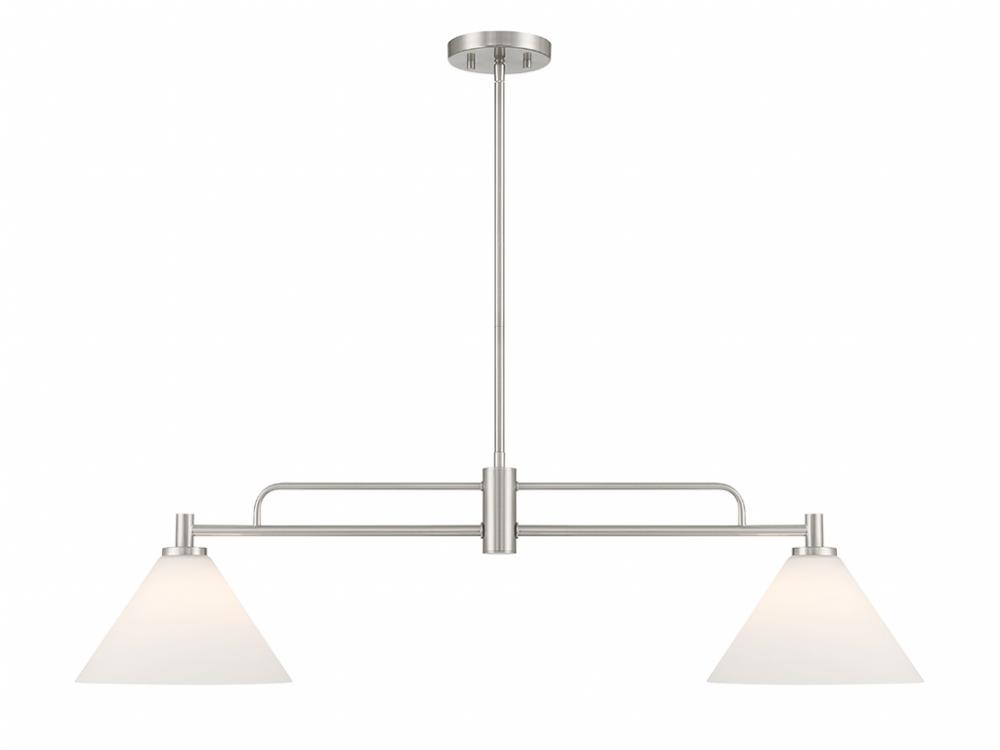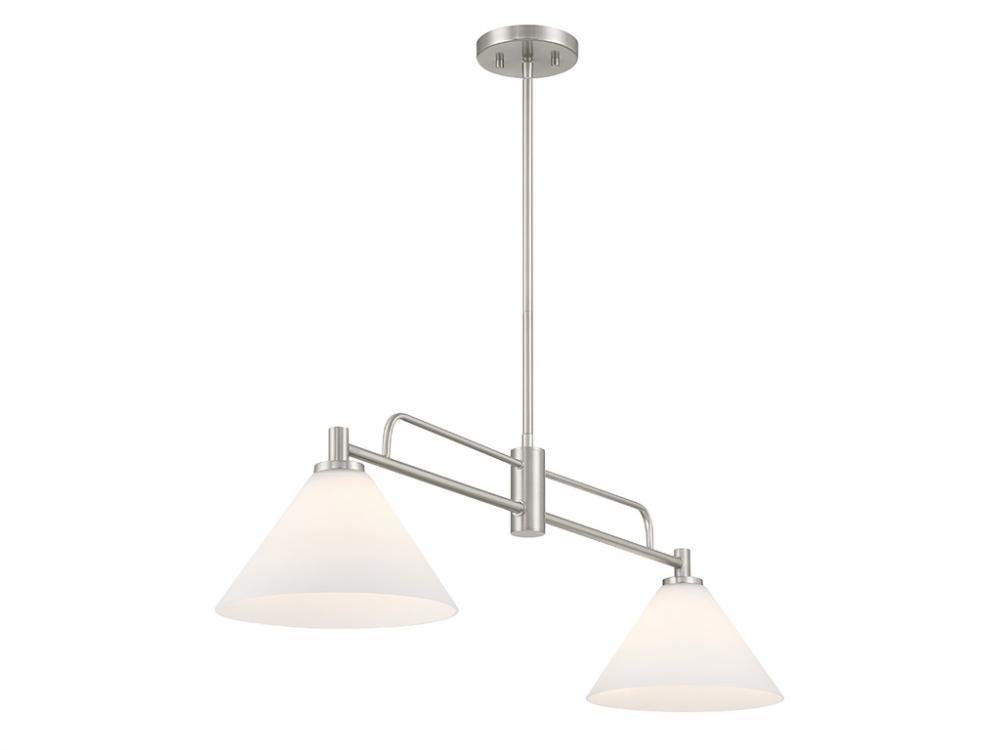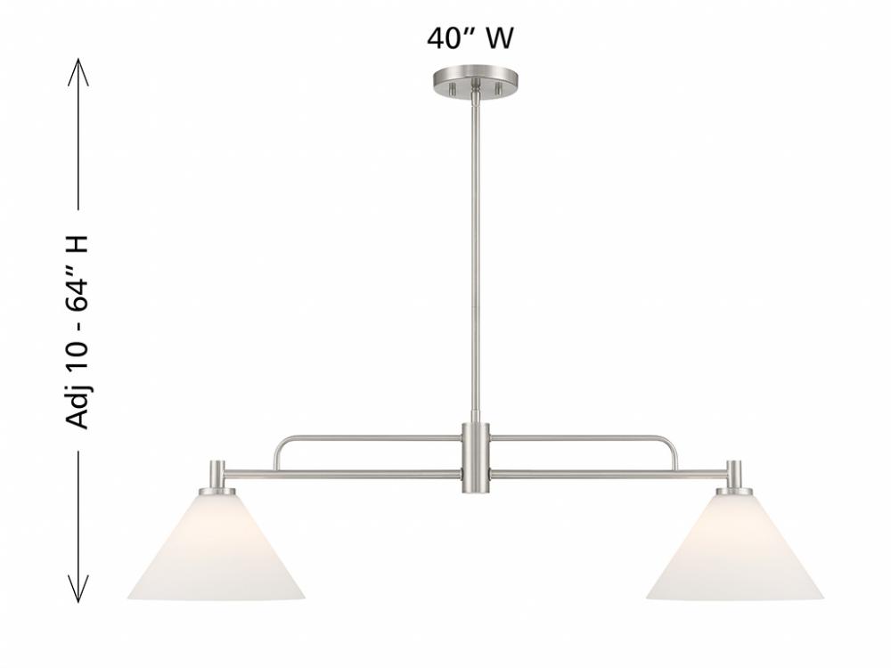 This crisp and elegant 2-light island pendant is a perfect way to illuminate a kitchen island, a long dining table, a billiards room or any other stylish space. Conical shades of opal white glass provide bright, smooth light. Understated detailing, finished in Brushed Nickel, adds a thoughtful touch. Adjustable height ranges from 10" to 64". Comes with eight 12" downrods and two 6" downrods. 40" in width. Uses 2 standard size bulbs of up to 60 watts per bulb. Bulbs not included.