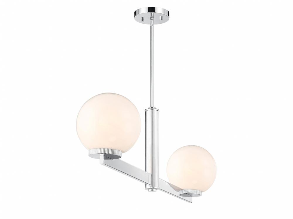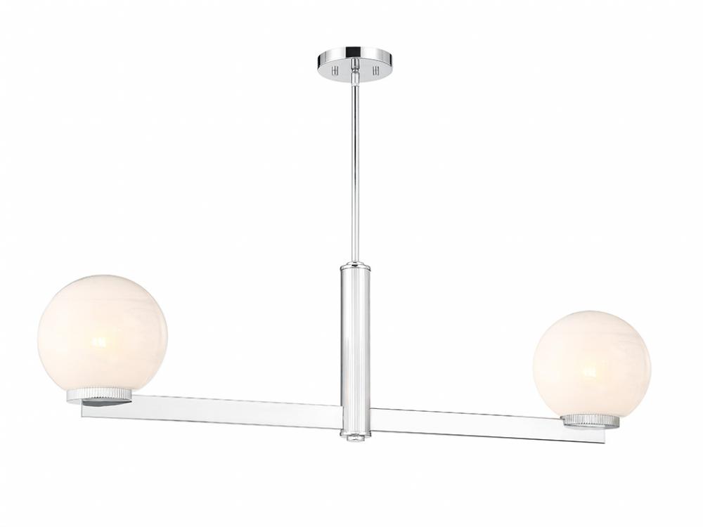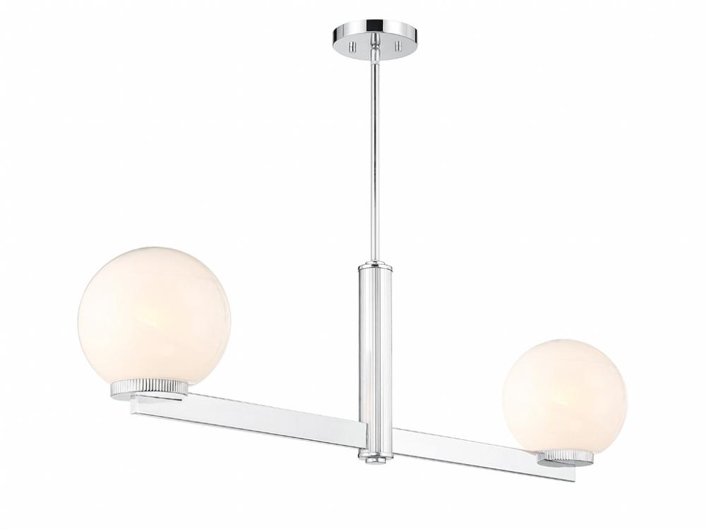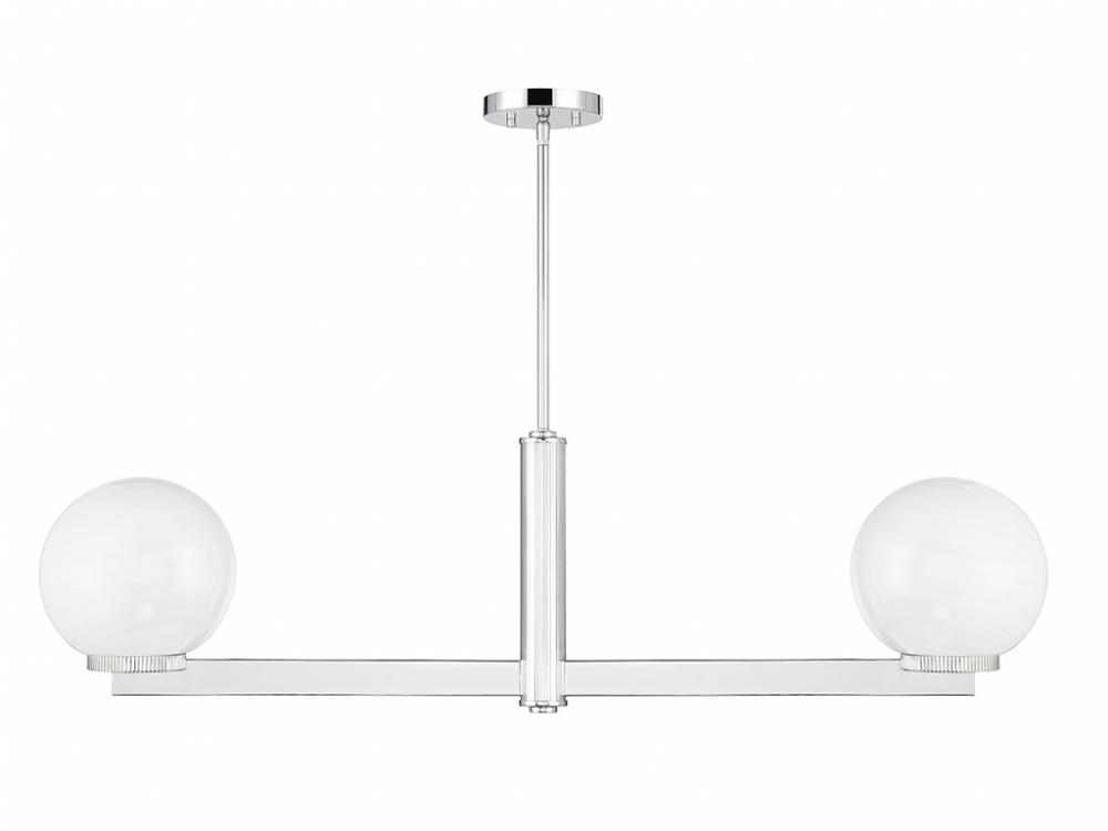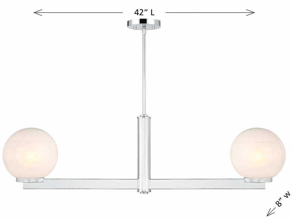 This 2-light linear chandelier flaunts a fabulously Art Deco look. The slim, straight arms are each topped with an orb of strie glass featuring dazzling swirls that draw the eye, soften the glow and work beautifully with the Chrome finish. Knurled detailing below each glass shade adds an extra touch of style. This linear chandelier is 42" in length, 8" in width and has an adjustable height ranging from 12" to 66". Comes with four 12" downrods and one 6" downrod. Uses 2 standard size bulbs of up to 60 watts per bulb. Bulbs not included.