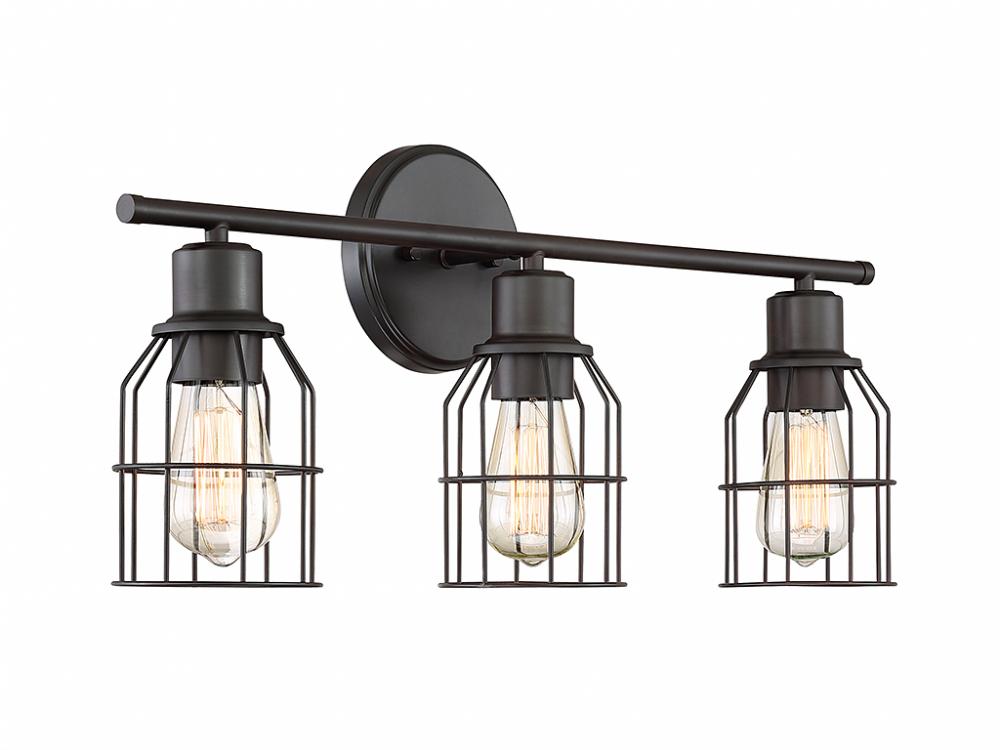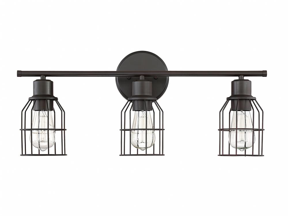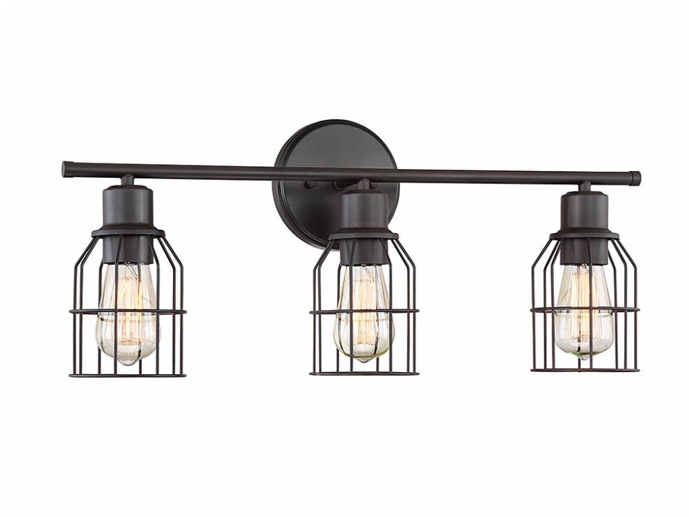 This industrial-style 3-light bath bar offers thin wire cage shades over exposed light sources and an Oil Rubbed Bronze finish. 11" in height and 24" in width.