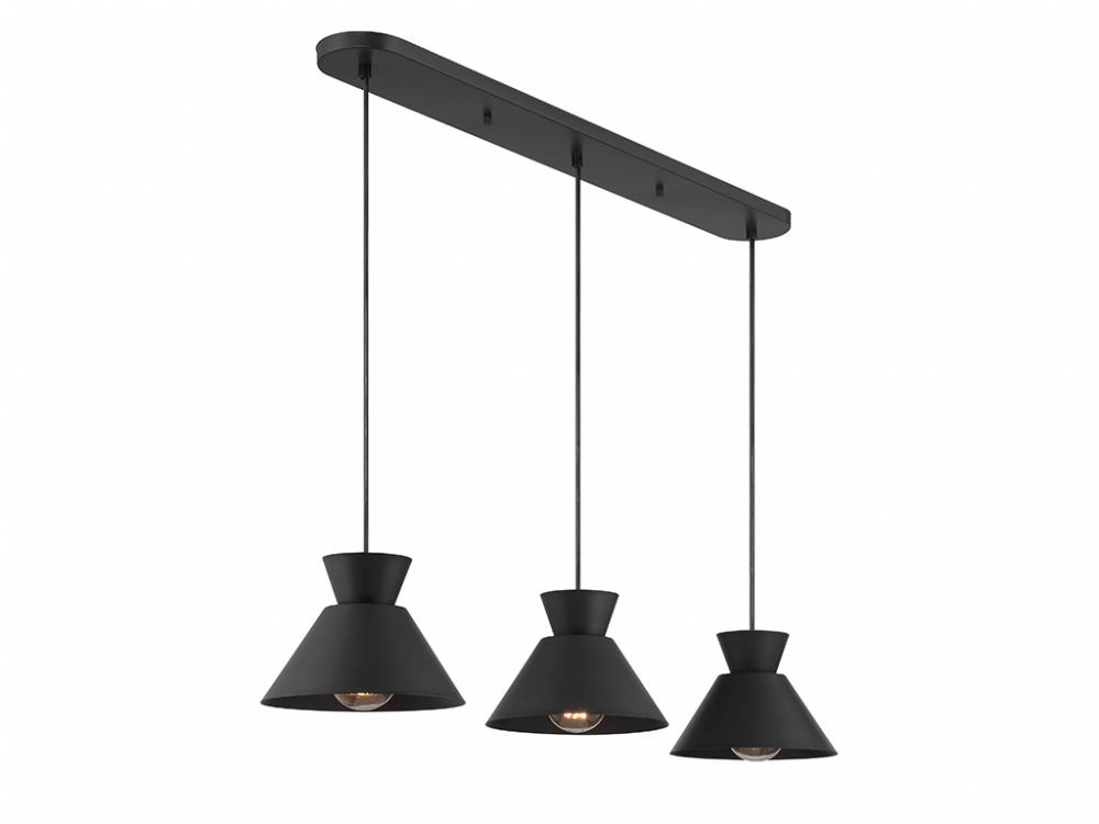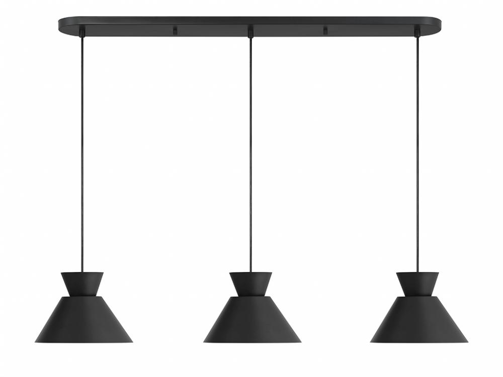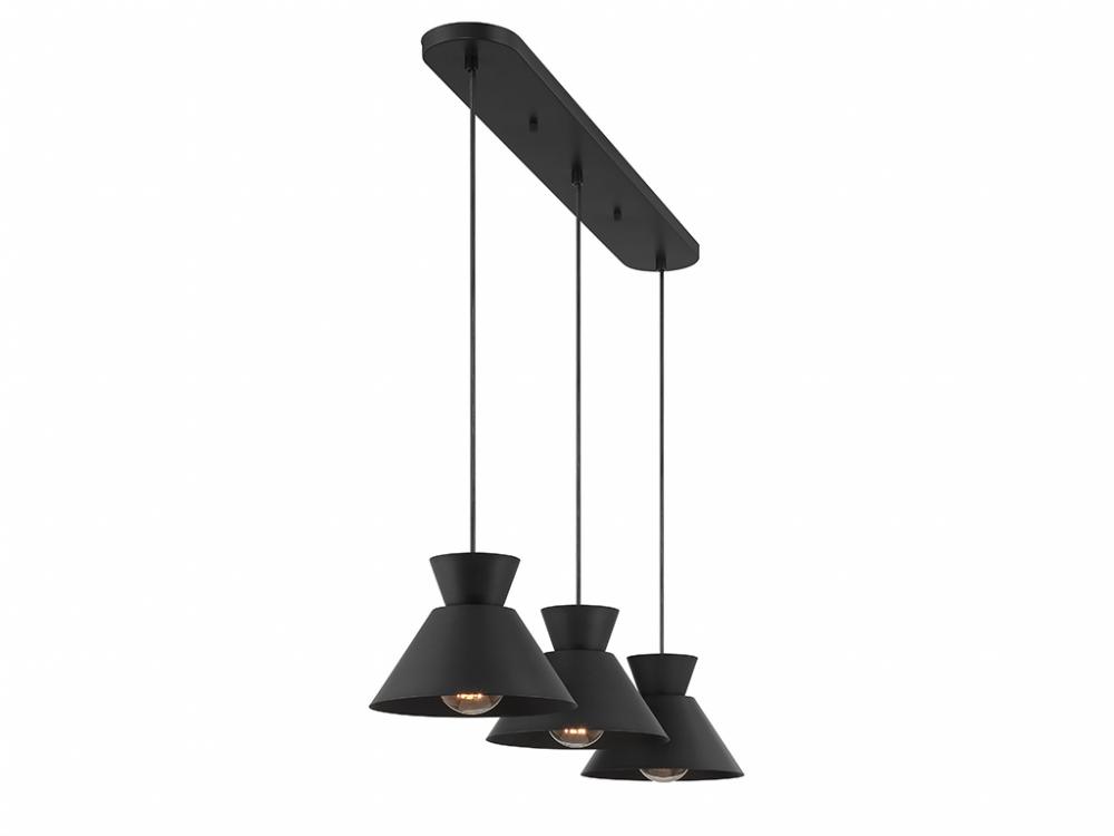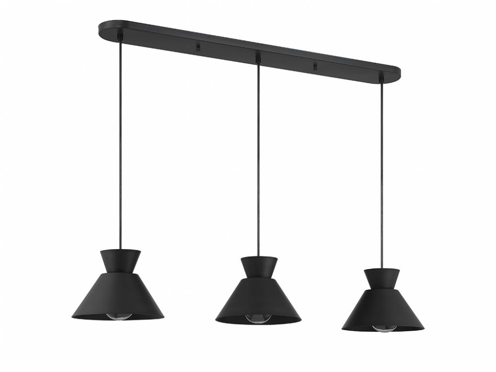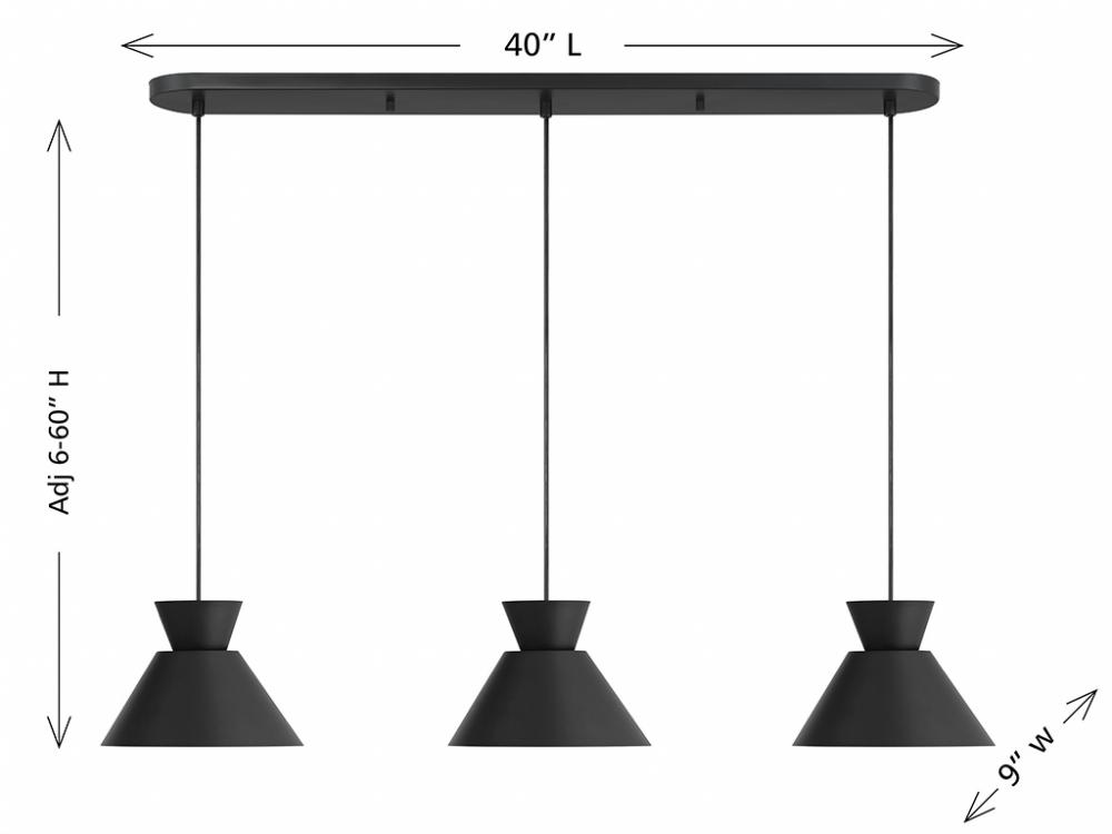 Get iconic mid-century modern style with this 3-light linear pendant, which has chic conical solid metal shades finished in Matte Black. The sleek black hanging cords let you adjust the hanging height of each light to meet the needs of your space. The height ranges from 6" to 126". The length is 40" and the width is 9". Uses 3 standard size bulbs of up to 60 watts per bulb. Bulbs not included.