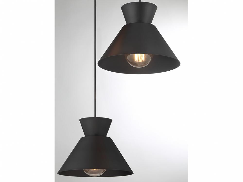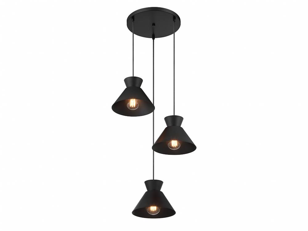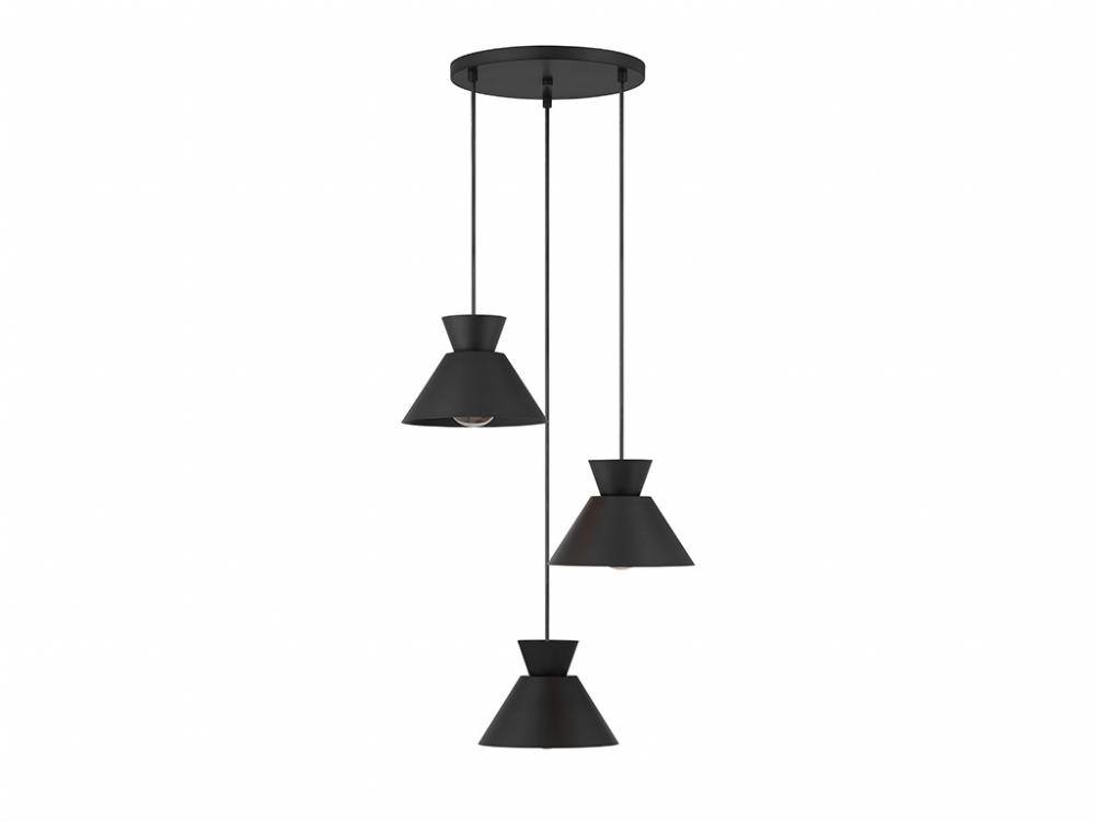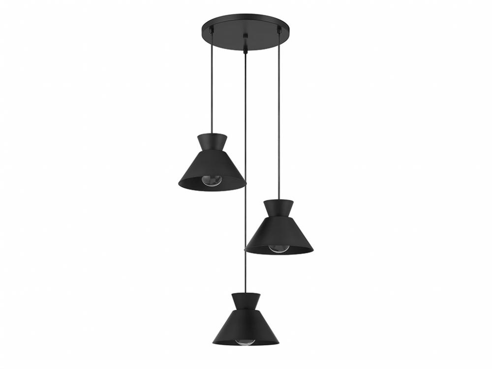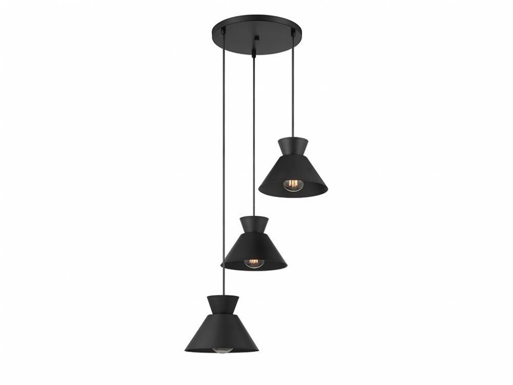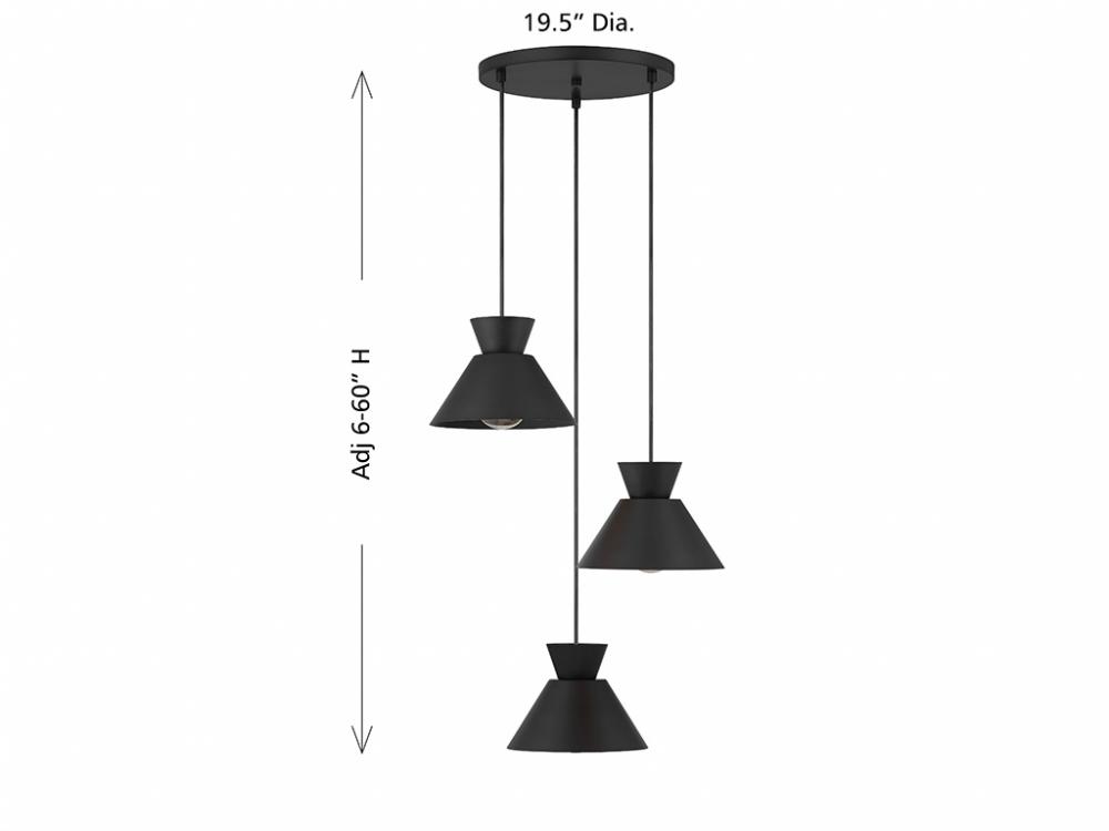 Get iconic mid-century modern style with this 3-light pendant, which has chic conical solid metal shades finished in Matte Black. The sleek black hanging cords allow you to adjust the hanging height of each light to meet the needs of your space. The height ranges from 6" to 126". The width is 19.5". Uses 3 standard size bulbs of up to 60 watts per bulb. Bulbs not included.