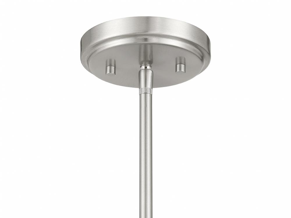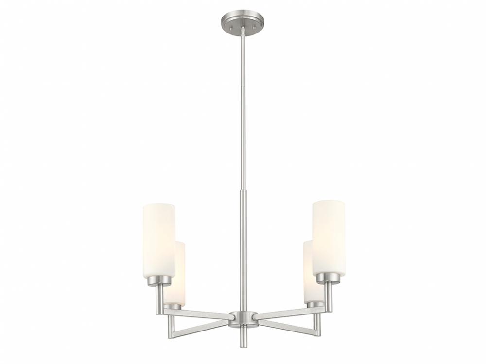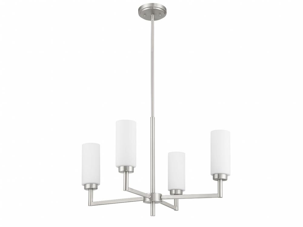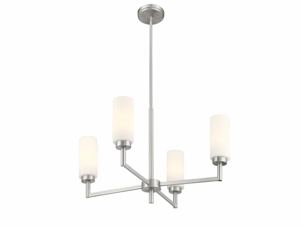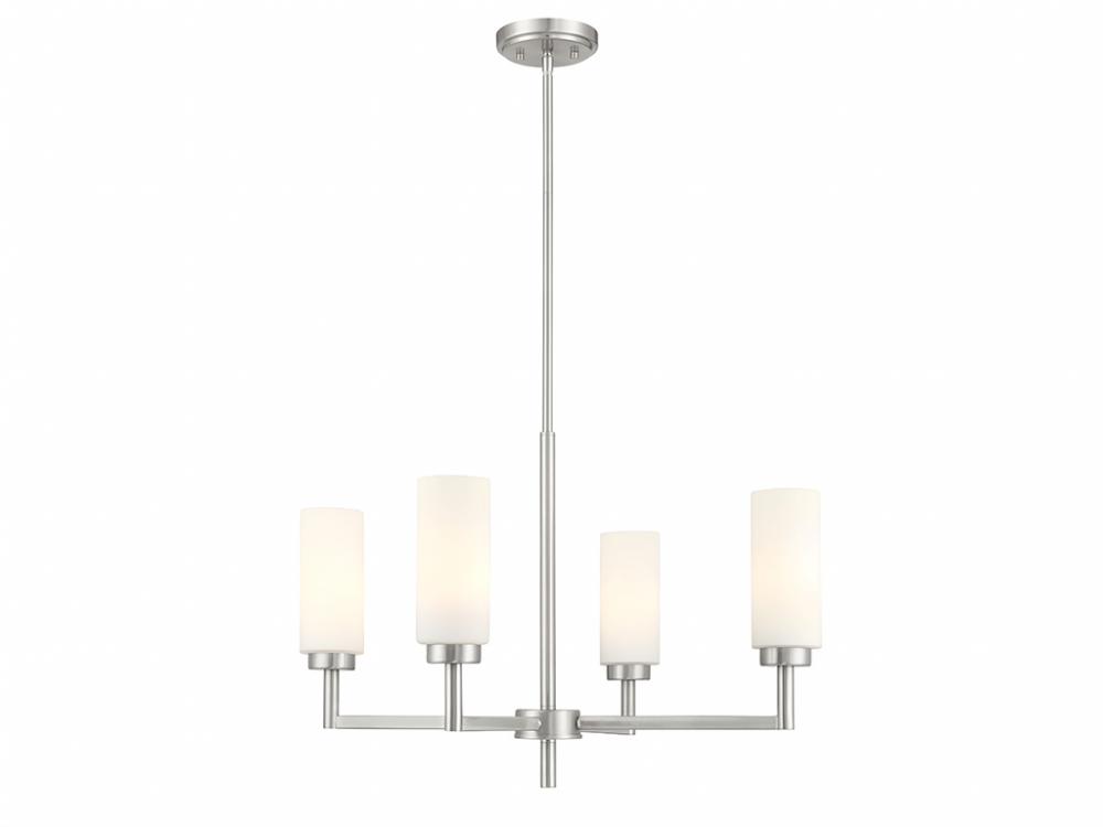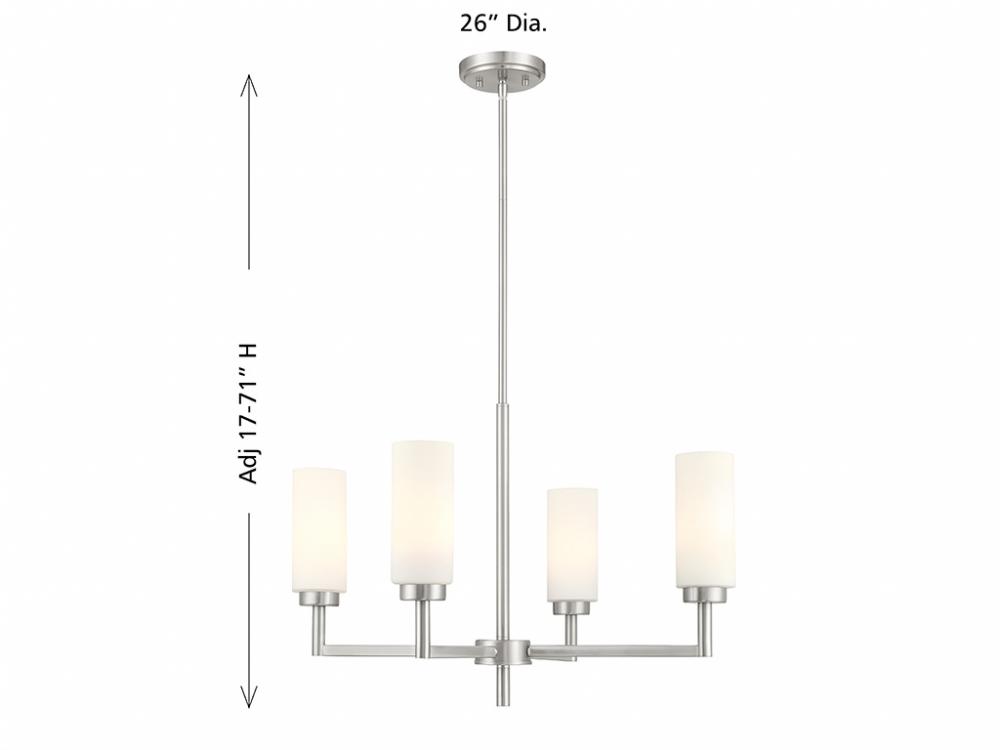 Get glowing with this angular, stylish 4-light chandelier. Each arm is finished in Brushed Nickel and holds a tall, sleek cylinder of white opal glass for bright yet flattering light. This chandelier is 26" in width and has an adjustable height ranging from 17" to 71". It comes with four 12" downrods and one 6" downrod. Uses 4 candelabra size bulbs of up to 60 watts per bulb. Bulbs not included.