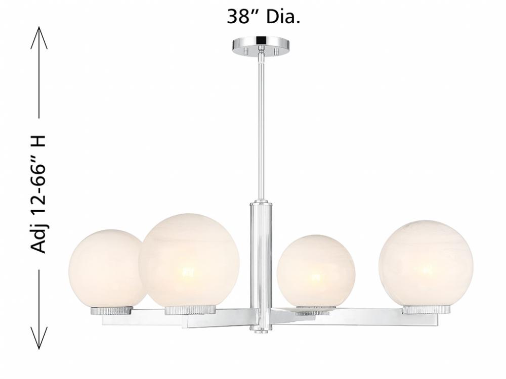 This 4-light chandelier flaunts a fabulously Art Deco look. Each slim, straight arm is topped with an orb of strie glass featuring dazzling swirls that draw the eye, soften the glow and work beautifully with the Chrome finish. Knurled detailing below each glass shade adds an extra touch of style. This chandelier is 38" in width and has an adjustable height ranging from 12" to 66". Comes with four 12" downrods and one 6" downrod. Uses 4 standard size bulbs of up to 60 watts per bulb. Bulbs not included.