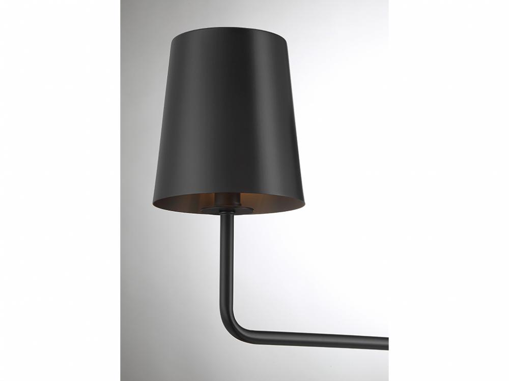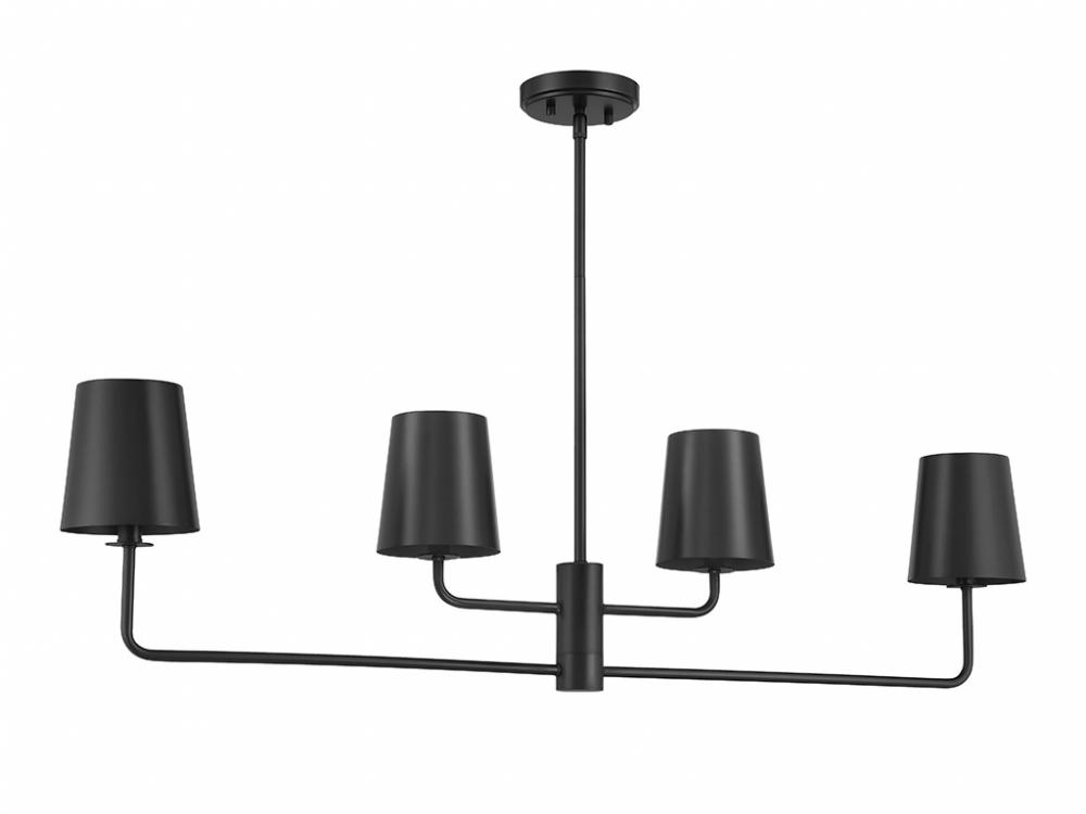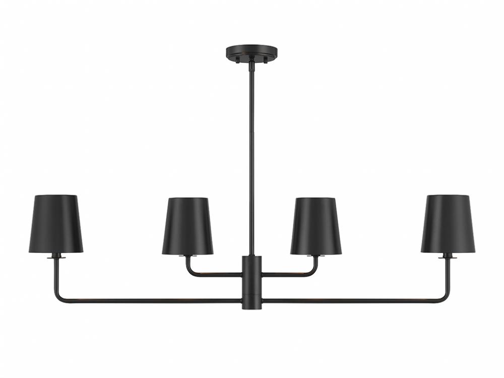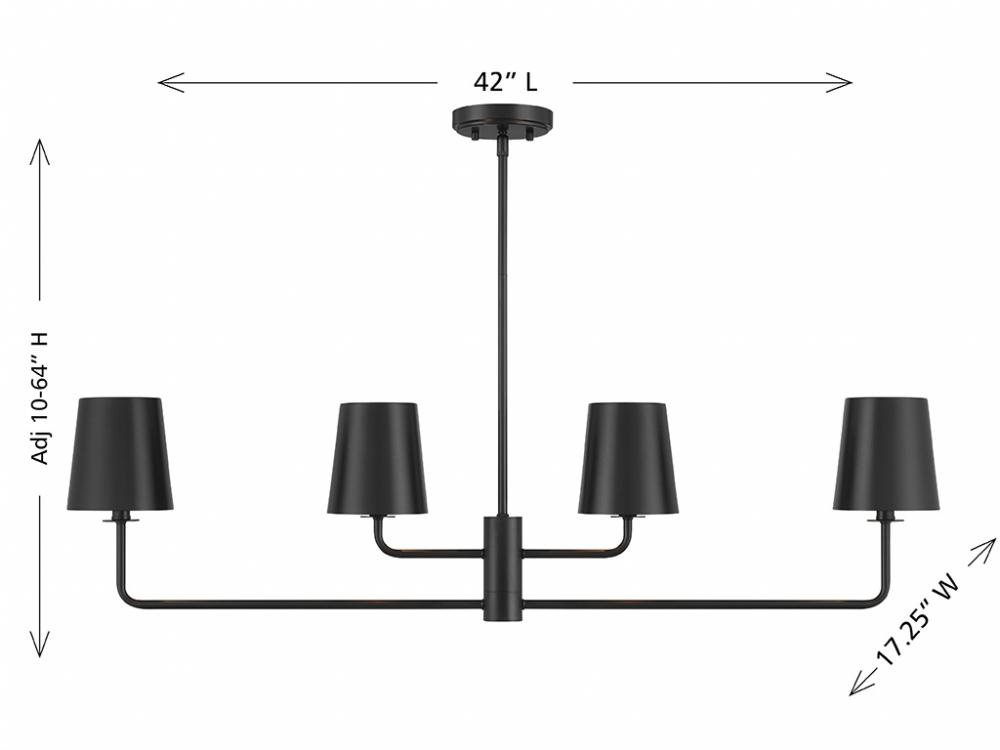 Heighten the drama in your home with this chic 4-light linear chandelier. The whole fixture, including the metal shades, is finished in Matte Black for a glow that is boldly concentrated like a spotlight. Plus, you can adjust the two tiers of arms to really customize the look. This linear chandelier is 42" in length, 17.25" in width and has an adjustable height ranging from 10" to 64". It comes with four 12" downrods and one 6" downrod. Uses 4 standard size bulbs of up to 60 watts per bulb. Bulbs not included.